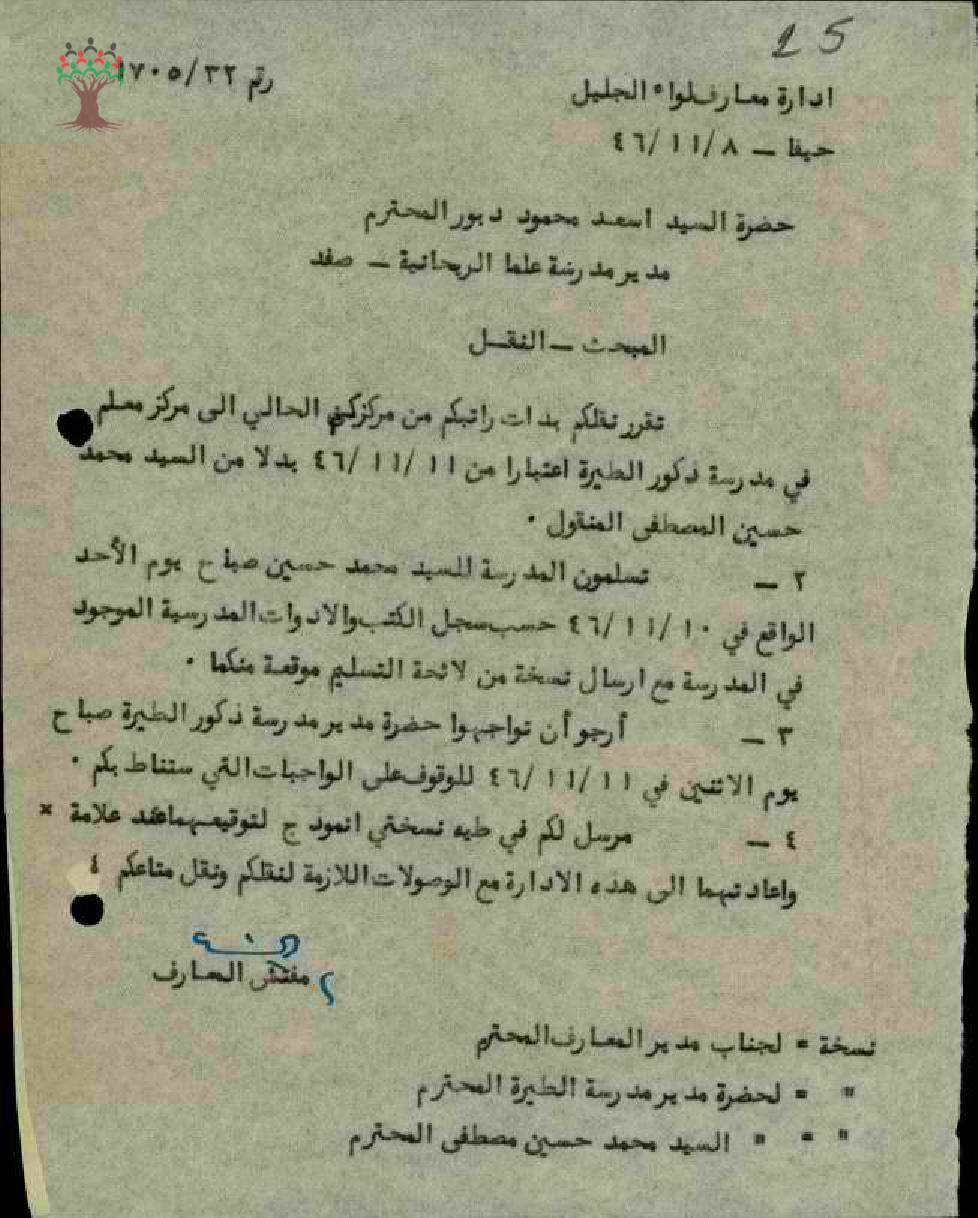 نقل المعلم أسعد دبور من مدرسة علما الريحانية الى مدرسة ذكور الطيرة