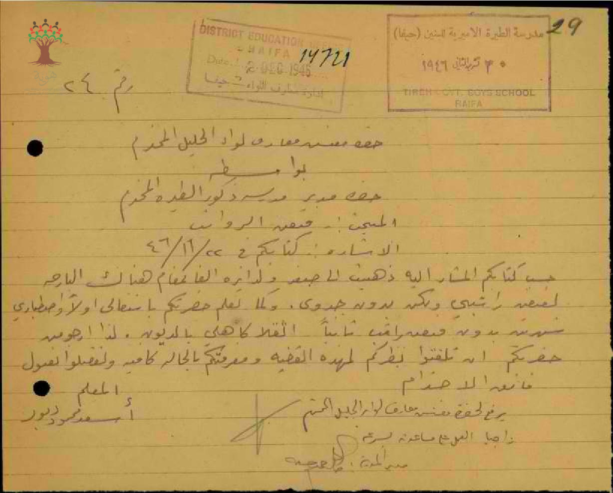 رسالة من المعلم أسعد دبور الى مفتش المعارف يبحث تأخر راتبه مدة شهرين