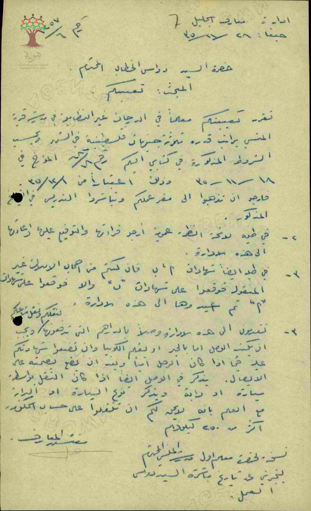 رسالة من مفتش المعارف إلى المعلم دواس خطاب يعلمه بقرار تعيينه معلماً غير نظامياً في مدرسة المنسي