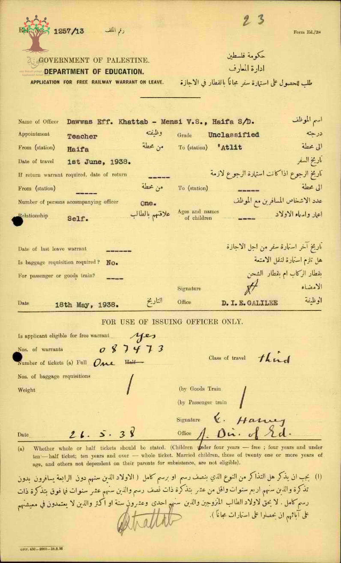 طلب للحصول على استمارة سفر مجاناً بالقطار في الإجازة للمعلم دواس خطاب