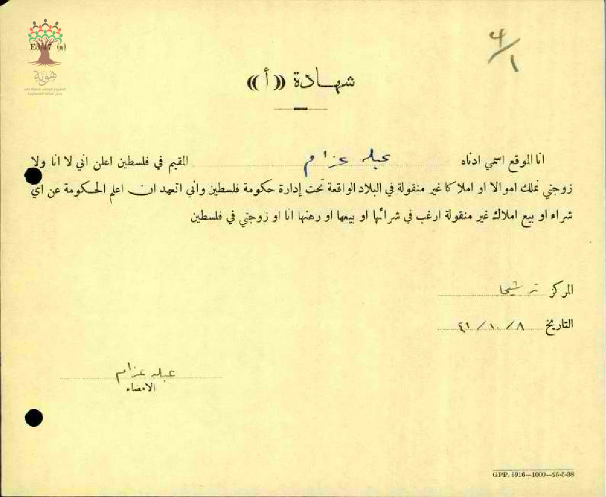 شهادة نفي ملكية-عبلة قيصر عزام/عكا