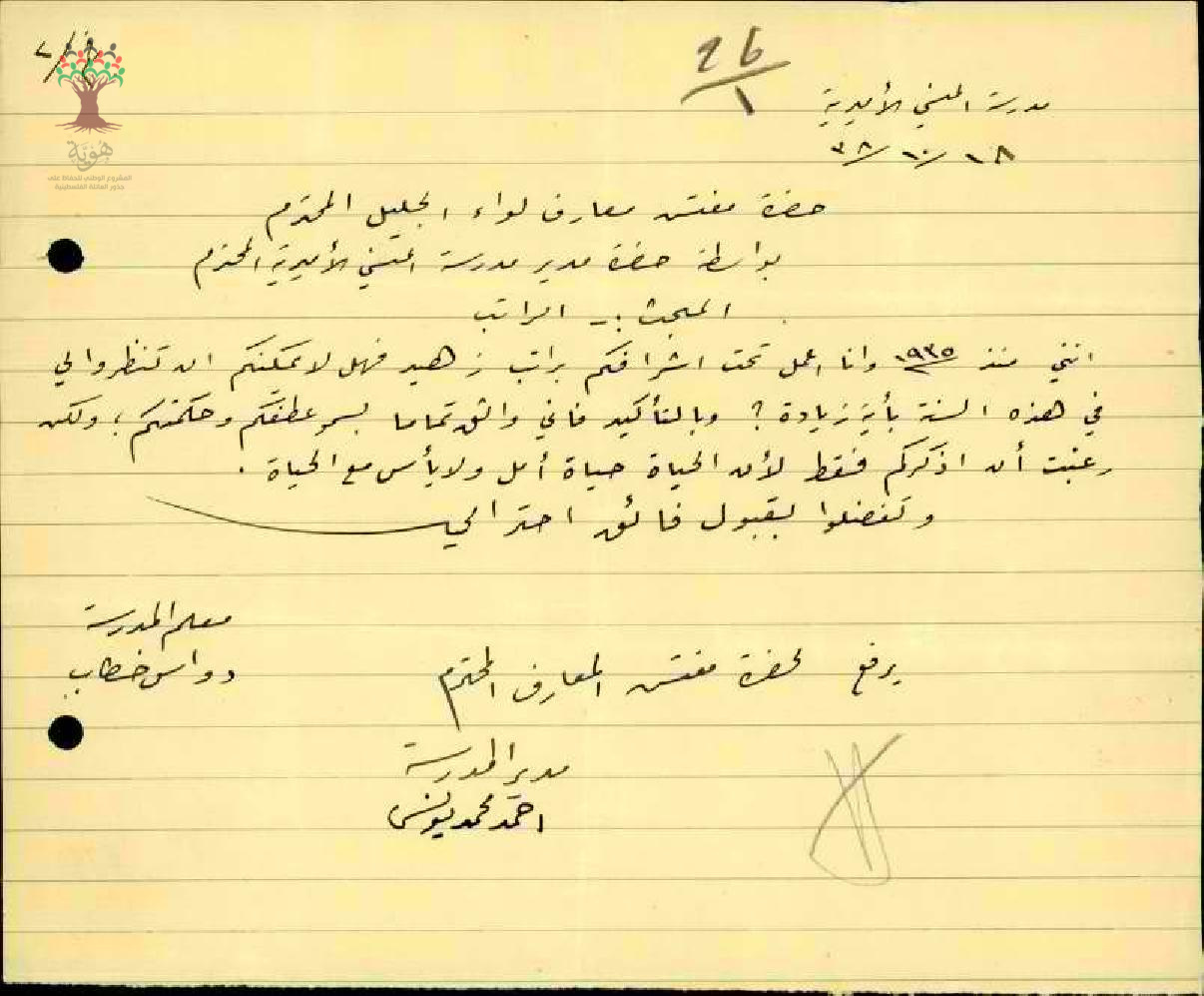 رسالة من المعلم دواس خطاب إلى مفتش المعارف يبحث معه أمر زيادة راتبه