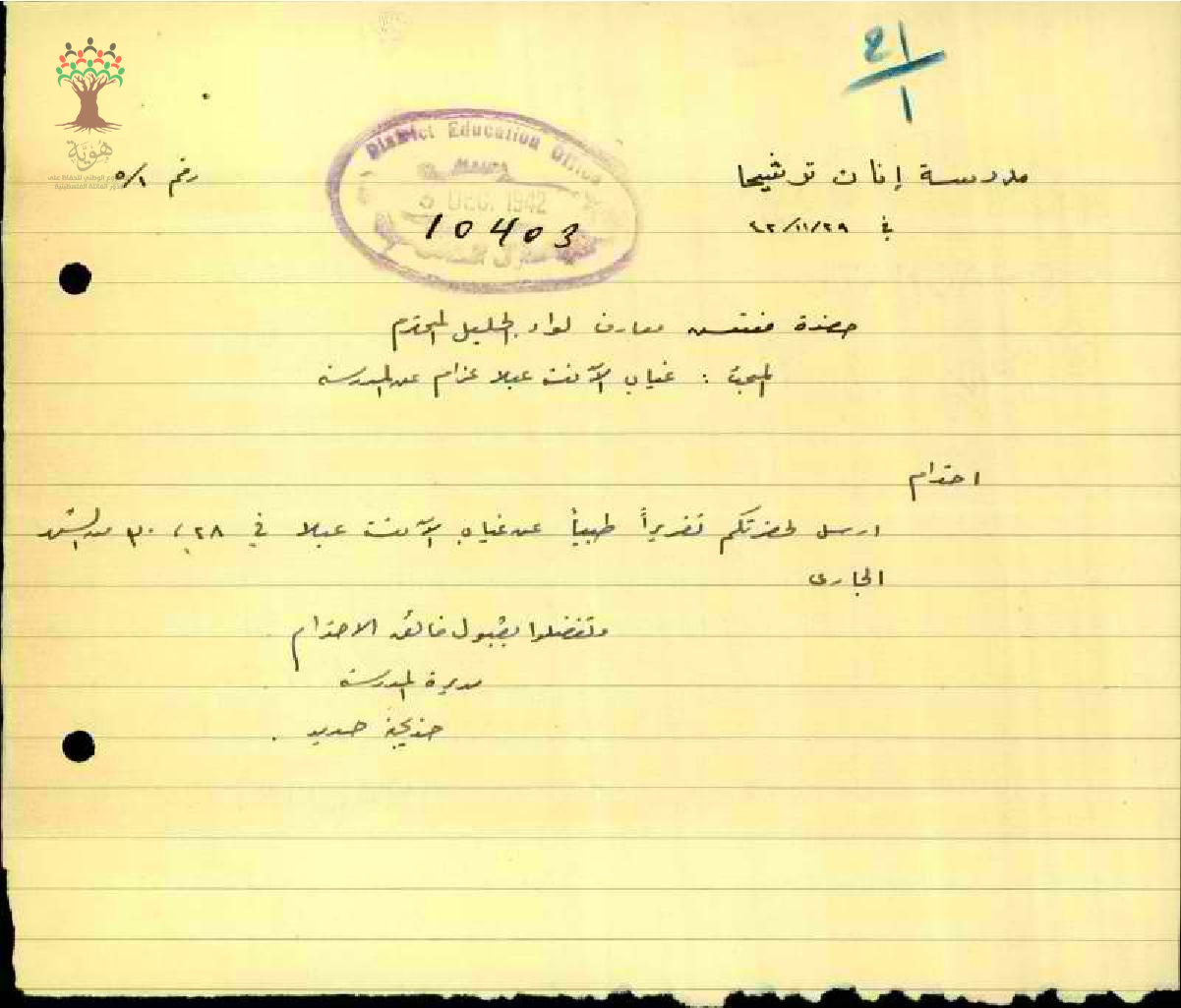 رسالة من مديرة مدرسة ترشيحا الى مفتش المعارف بخصوص غياب المعلمة عبلة عزام مرفقة بتقرير طبي