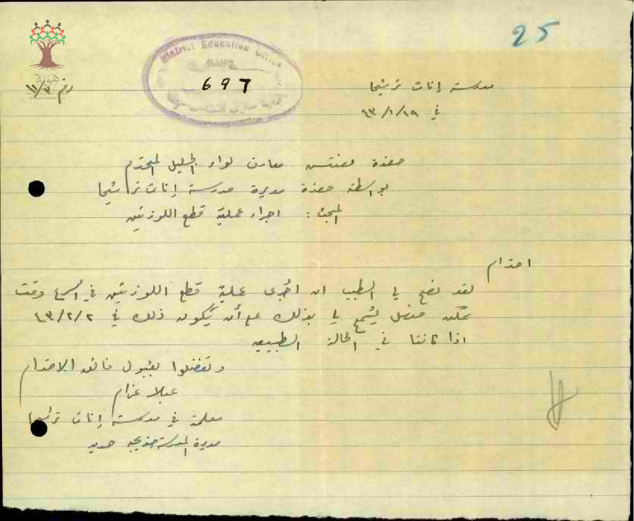مجموعة رسائل من مديرة مدرسة ترشيحا للبنات الى مفتش المعارف بخصوص غياب وعودة المعلمة عبلة عزام