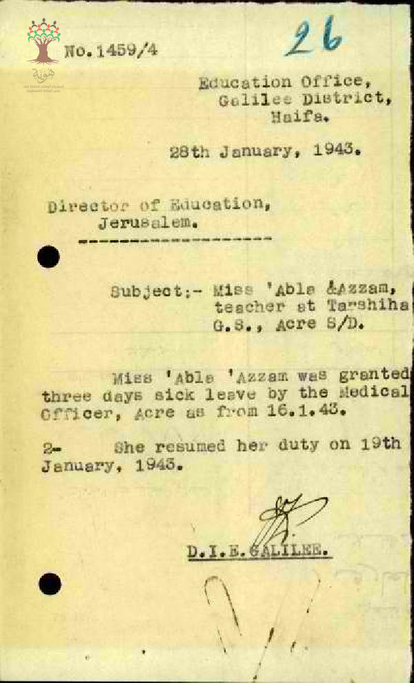 مجموعة رسائل من مفتش المعارف الى مدير المعارف بخصوص غياب وعودة المعلمة عبلة عزام