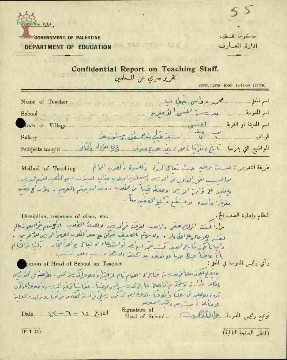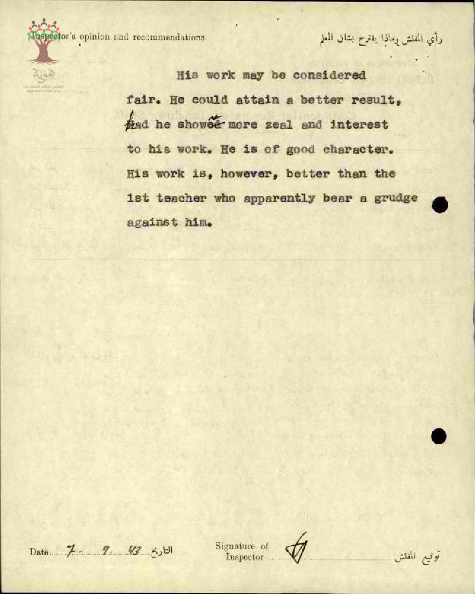 تقرير تفصيلي عن أداء المعلم دواس خطاب في مدرسة المنسي سنة 1943
