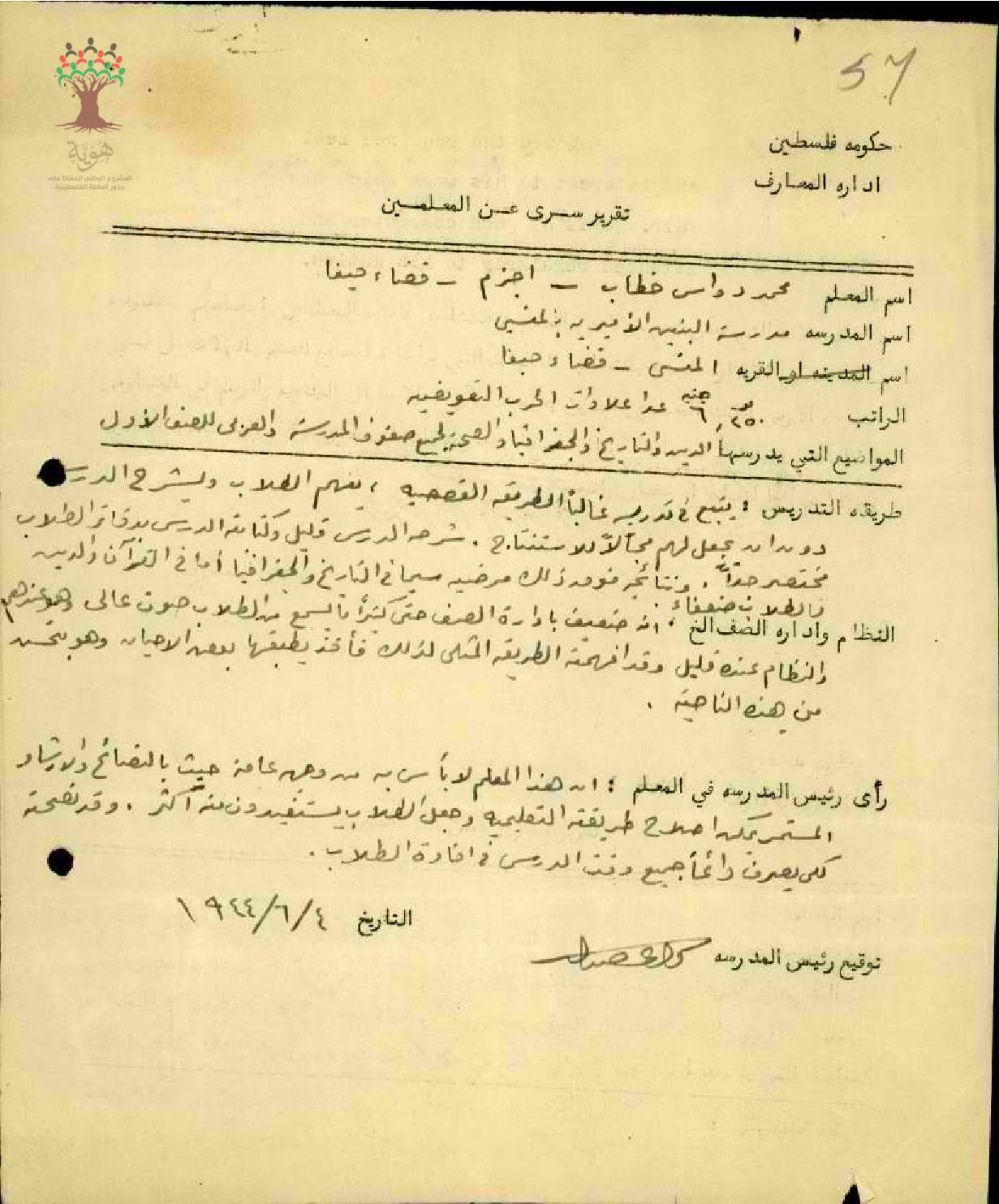 تقرير تفصيلي عن أداء المعلم دواس خطاب في مدرسة المنسي سنة 1944