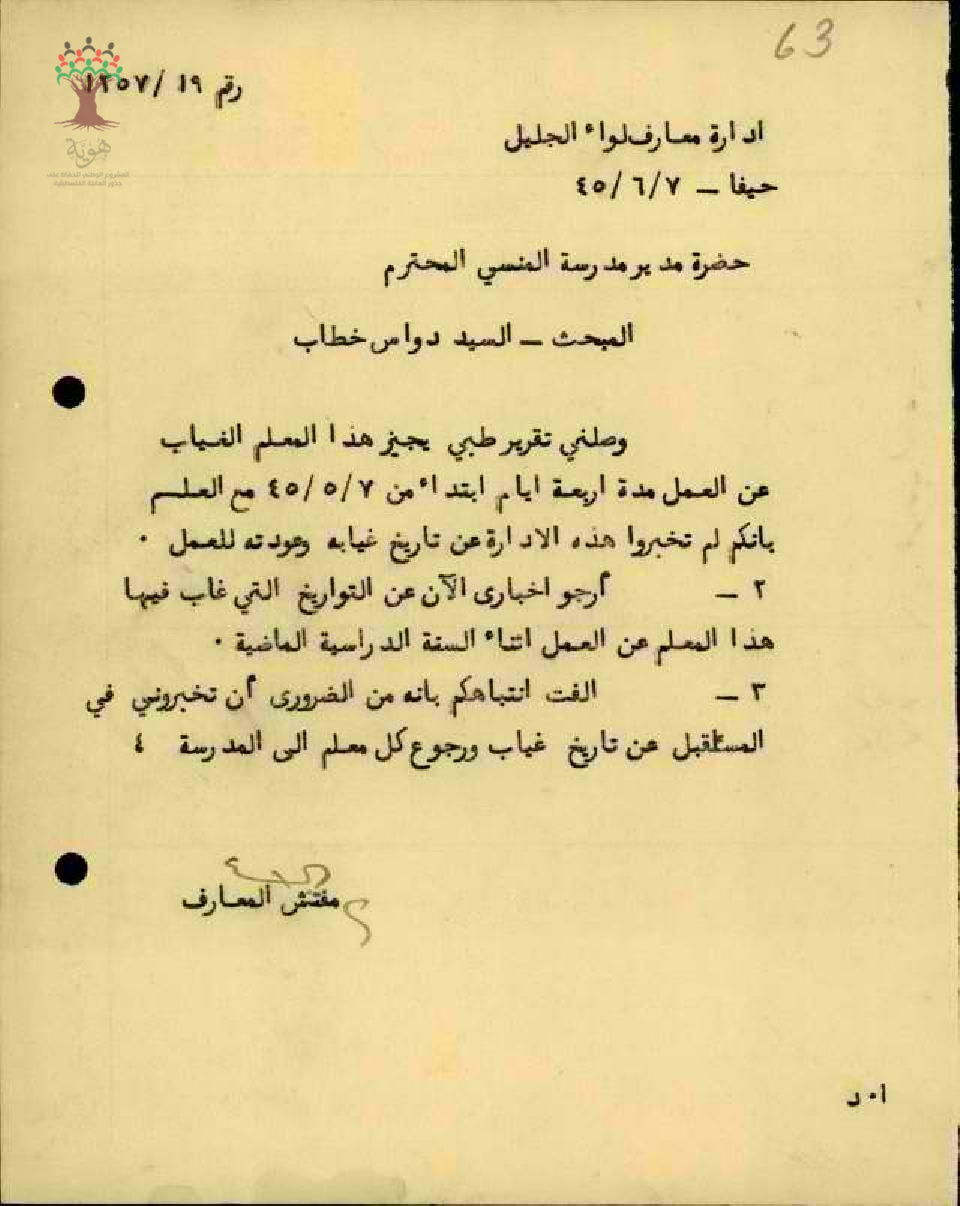 رسالة من مفتش المعارف إلى مدير مدرسة المنسي يخبره بإمكانية غياب المعلم دواس خطاب عن العمل مدة 4 أيام