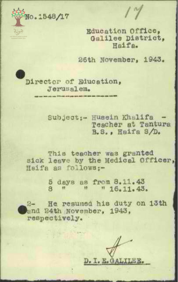 رسالة من مفتش المعارف الى مدير المعارف بخصوص اجازة مرضية للمعلم حسين عبد الكريم خليفة وعودته للعمل