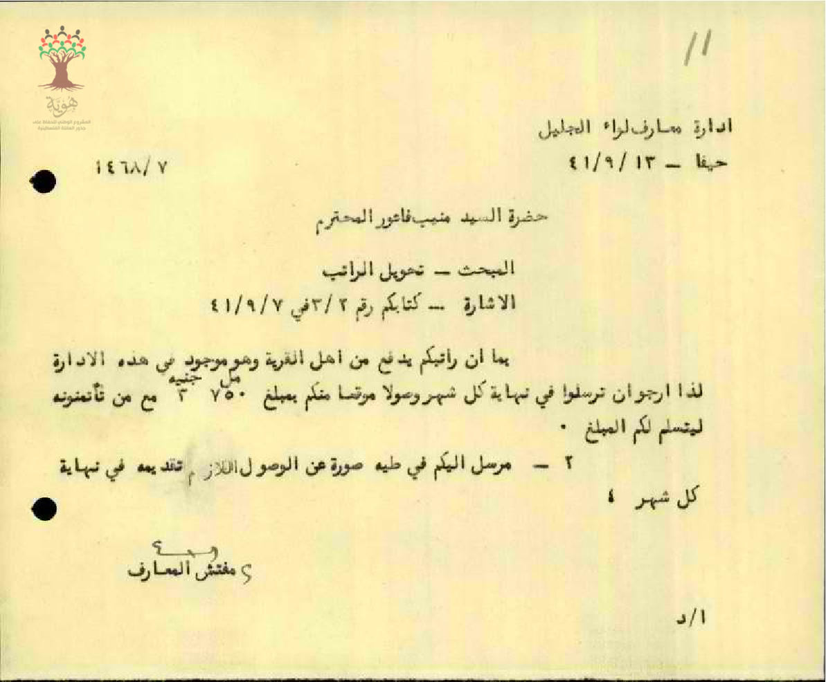 رسالة من مفتش المعارف إلى المعلم منيب فاعور يطلب ارساله في نهاية كل شهر وصولاً موقعة منه لتسليمه راتبه