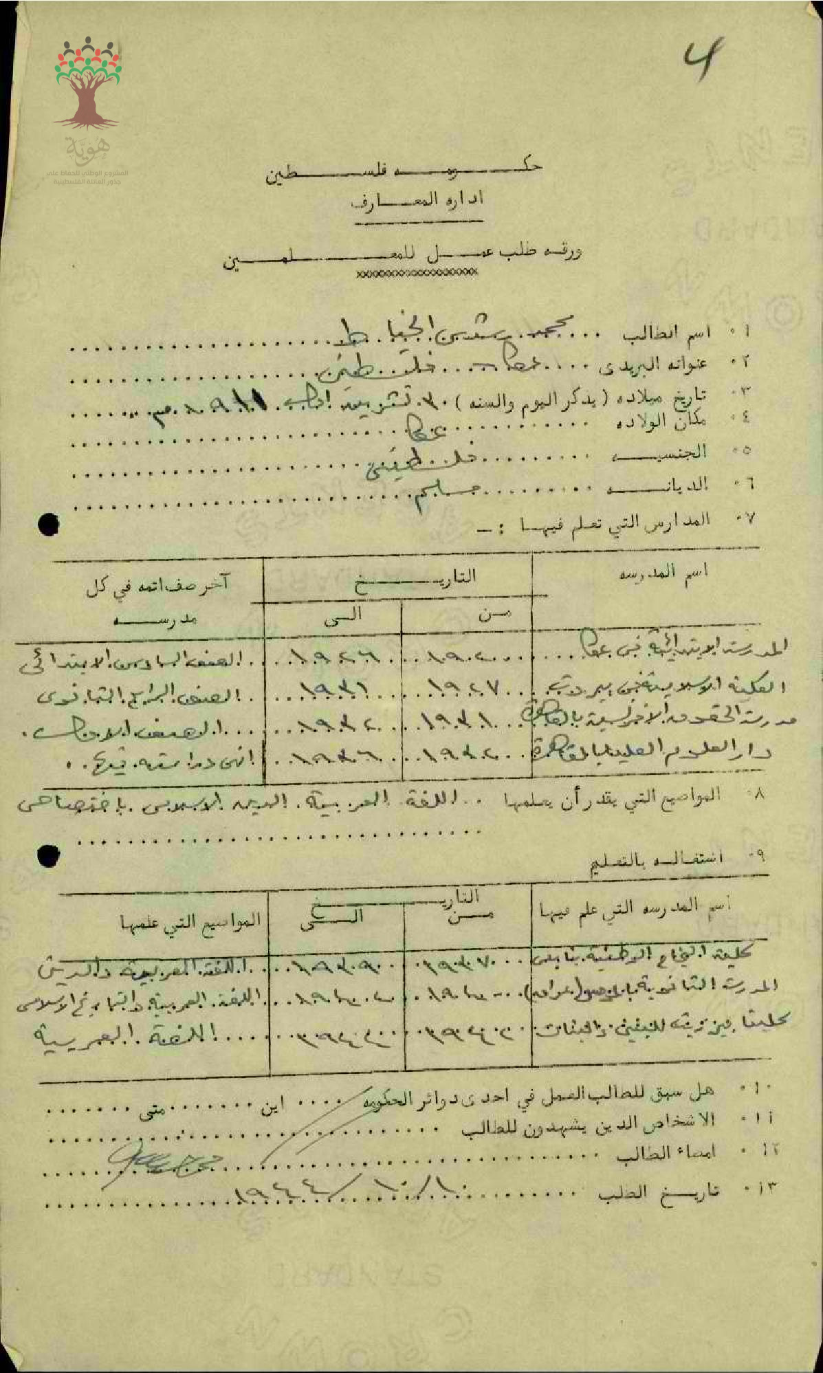 ورقة طلب عمل للمعلم محمد رشدي الخياط/عكا