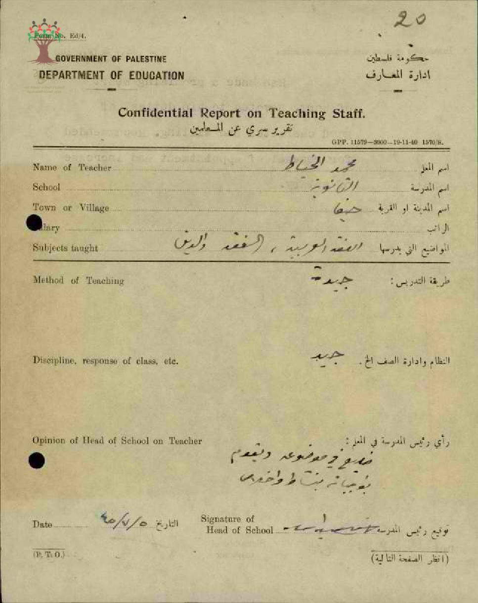 تقرير تفصيلي عن أداء المعلم محمد رشدي الخياط في مدرسة حيفا الثانوية سنة 1945