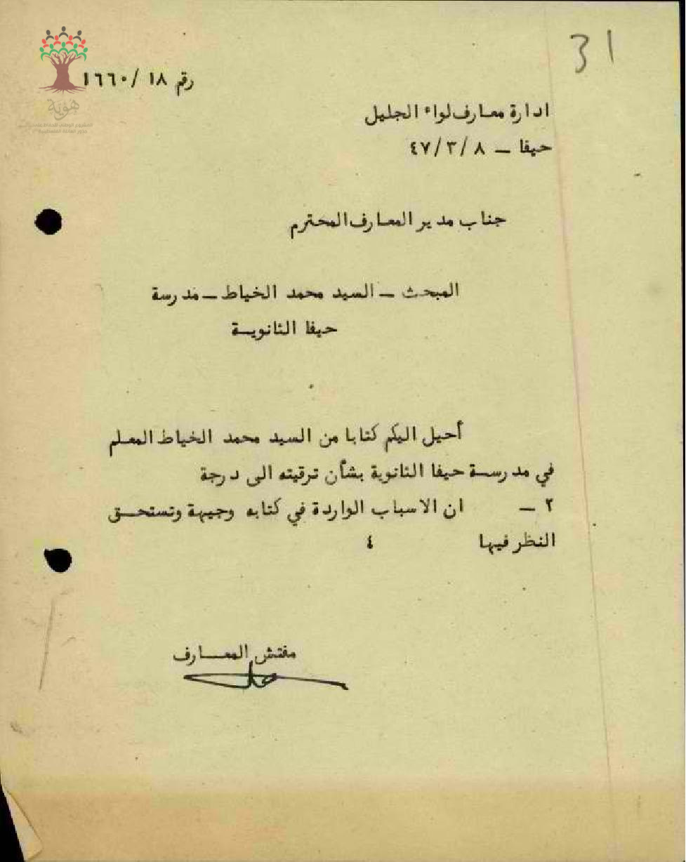 رسالة من مفتش المعارف الى مدير المعارف يبحث ترقية المعلم محمد رشدي الخياط