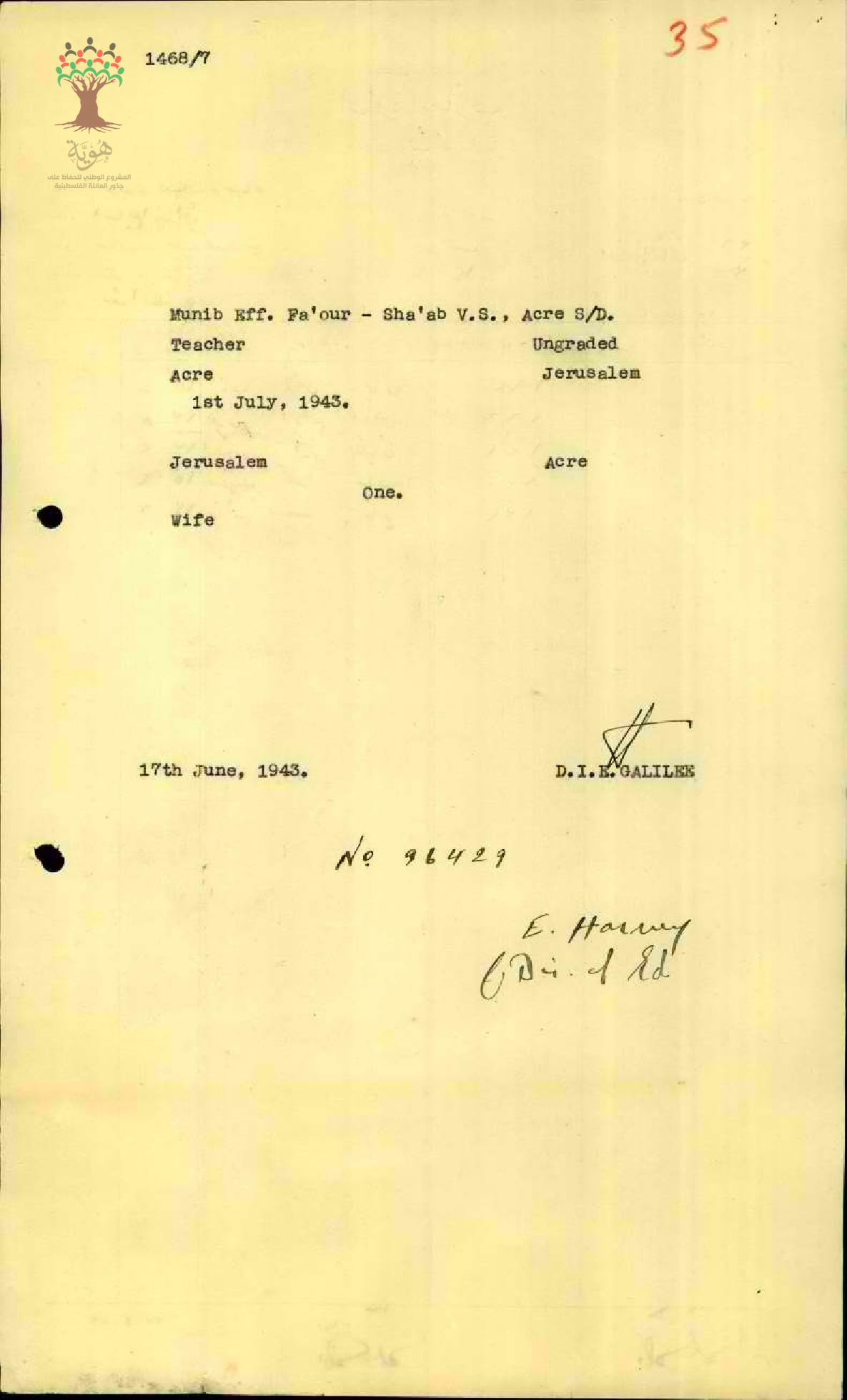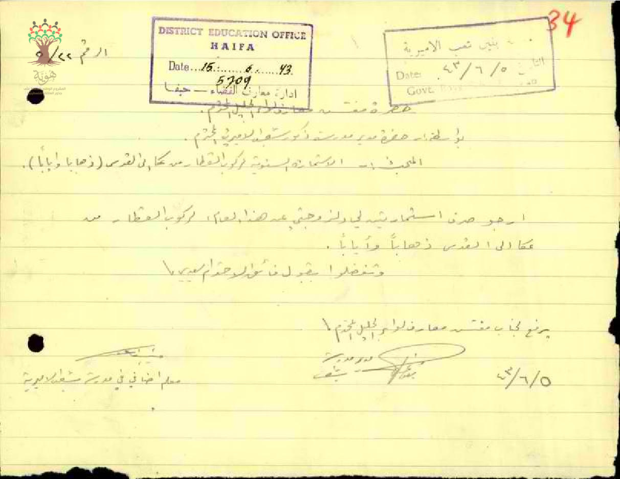 استمارة سفر مقدمة من المعلم منيب فاعور ، بلدة شعب للحصول على تذكرتي سفر بالقطار من عكا الى القدس ذهاباً وإياباً