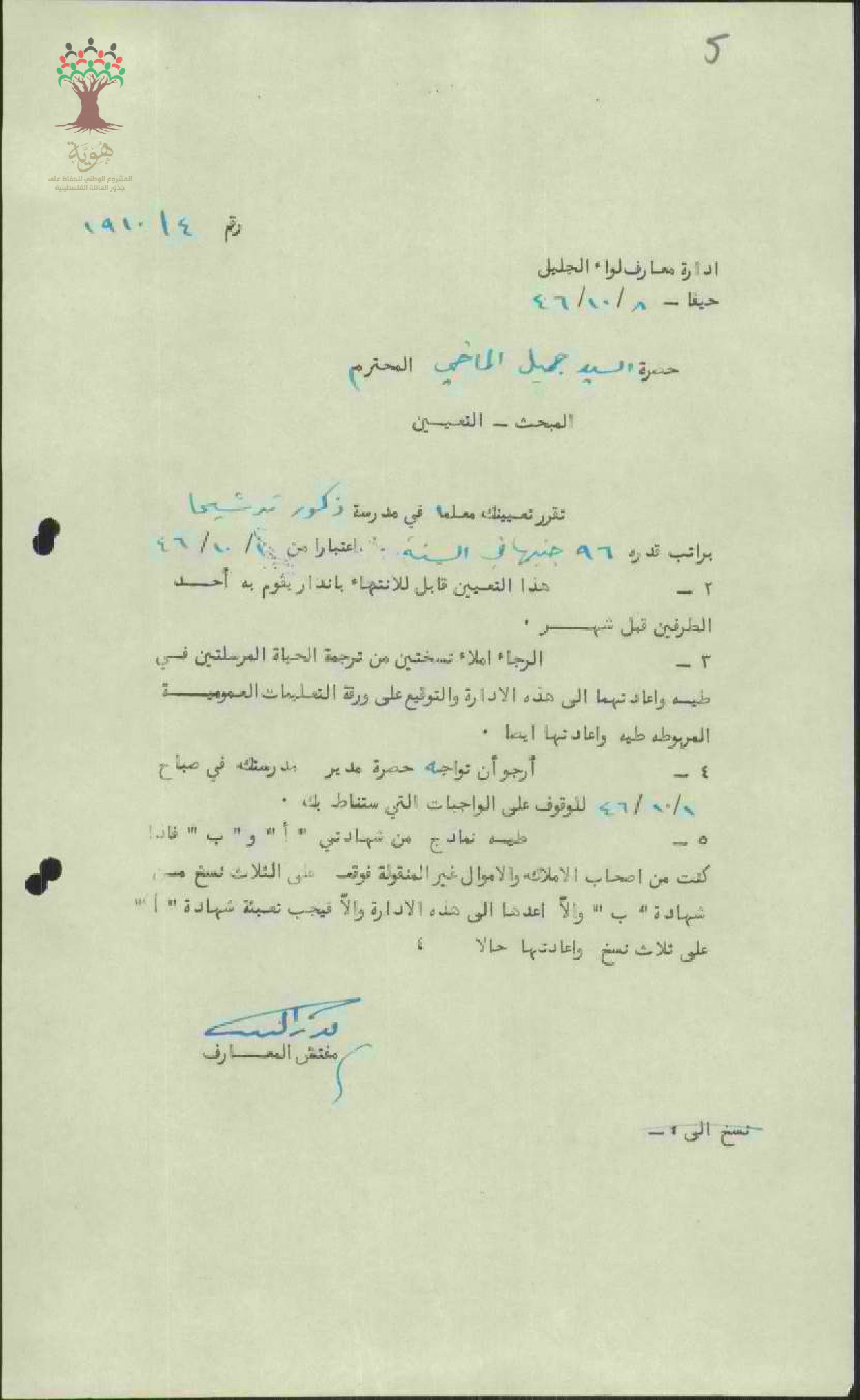تعيين المعلم جميل ماضي في مدرسة ترشيحا للذكور