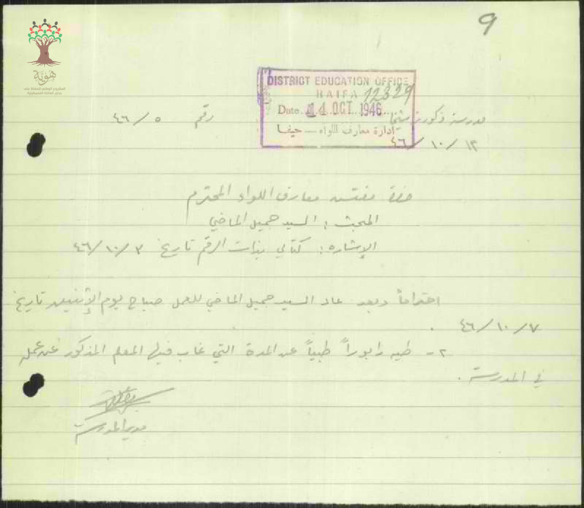 رسالة من مدير مدرسة ترشيحا الى مفتش المعارف بخصوص عودة المعلم جميل ماضي الى العمل