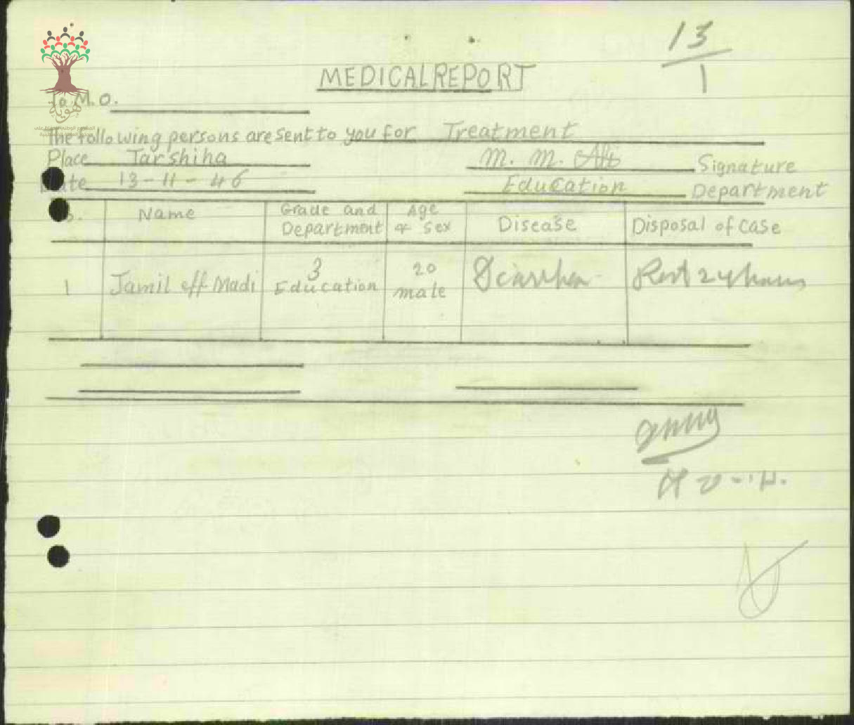 رسالة من مدير مدرسة ترشيحا الى مفتش المعارف بخصوص تغيب المعلم جميل ماضي بسبب المرض مرفقة بتقرير طبي