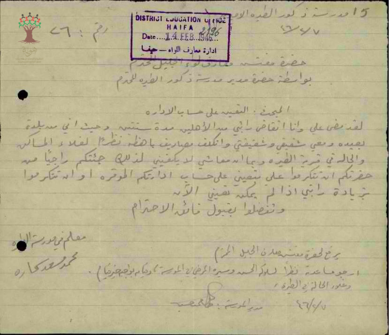 طلب زيادة راتب مقدم من المعلم محمد مسعد سمارة الى حضرة المفتش معارف لواء الجليل المحترم