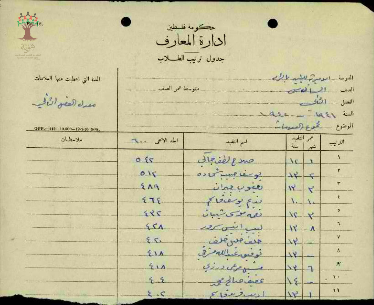 جدول ترتيب الطلاب في صف الاستاذ محمد مسعد سمارة في مدرسه الاميرية للبنين صف السادس