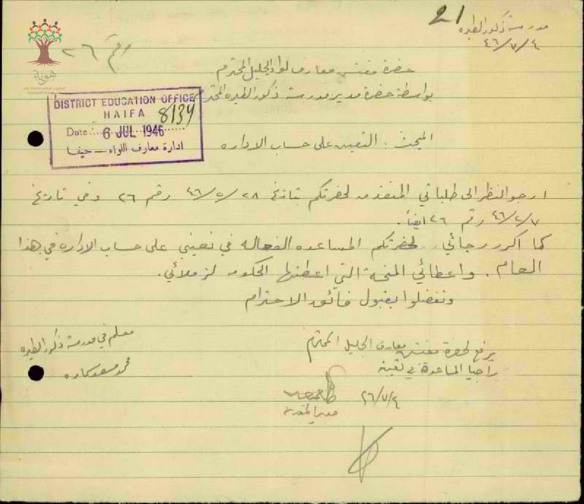 ورقة طلب عمل من محمد مسعد سمارة الى مدير مدرسه ذكور الطيره المحترم