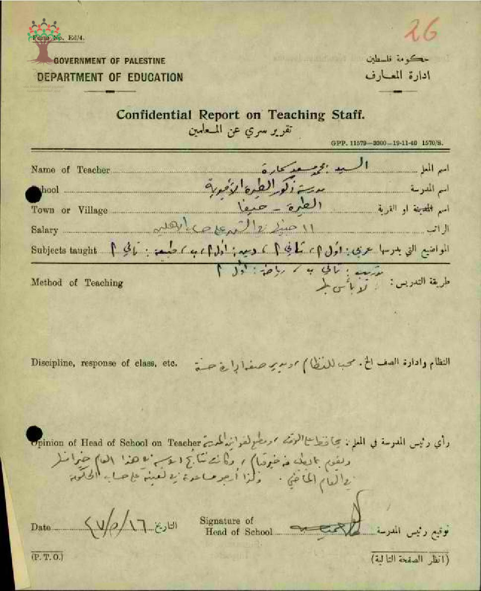 تقرير تفصيلي عن اداء المعلم محمد مسعد سمارة في مدرسه ذكور الطيره