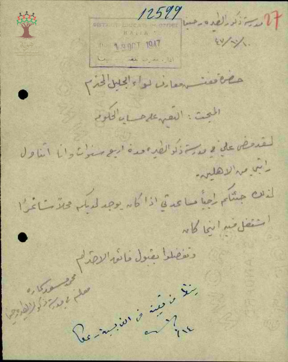 ورقه طلب عمل من محمد مسعد سمارة الى حضرة المفتش معارف لواء الجليل المحترم