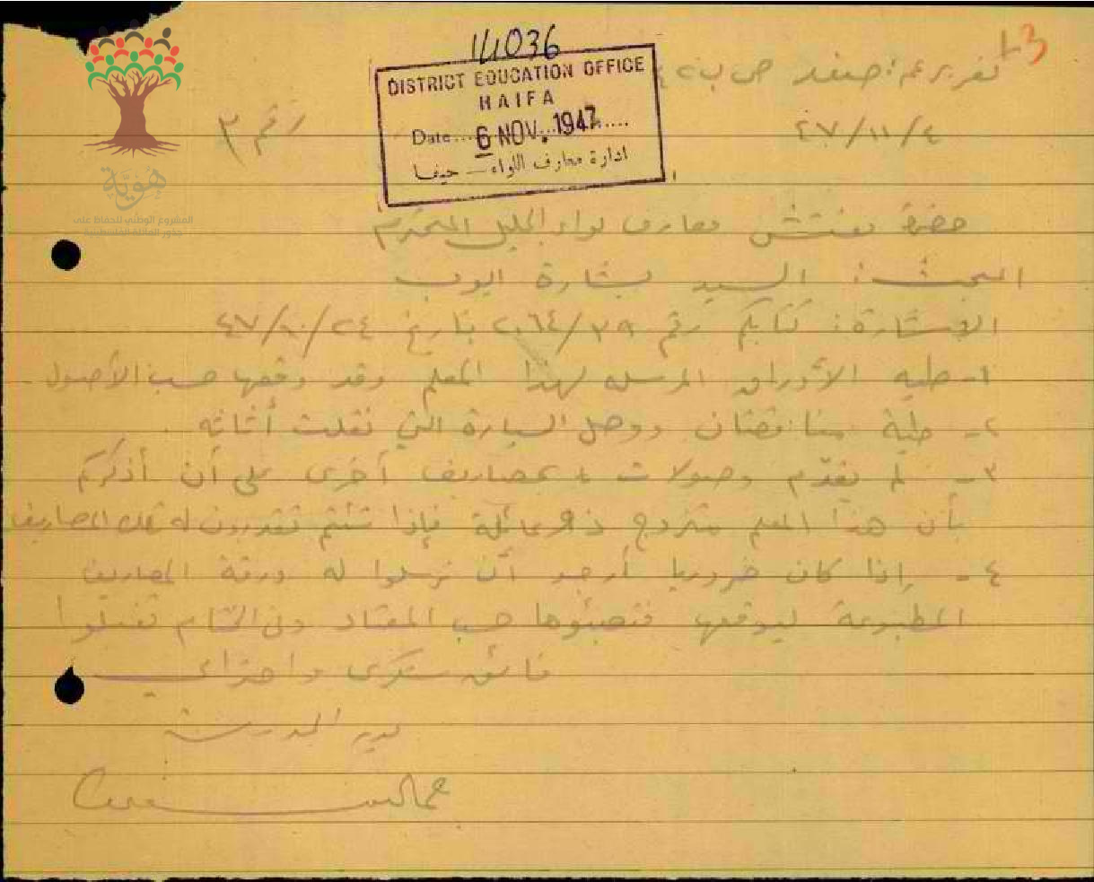 طلب مقدم من المعلم بشارة متري ايوب الى حضرة المفتش معارف لواء الجليل المحترم