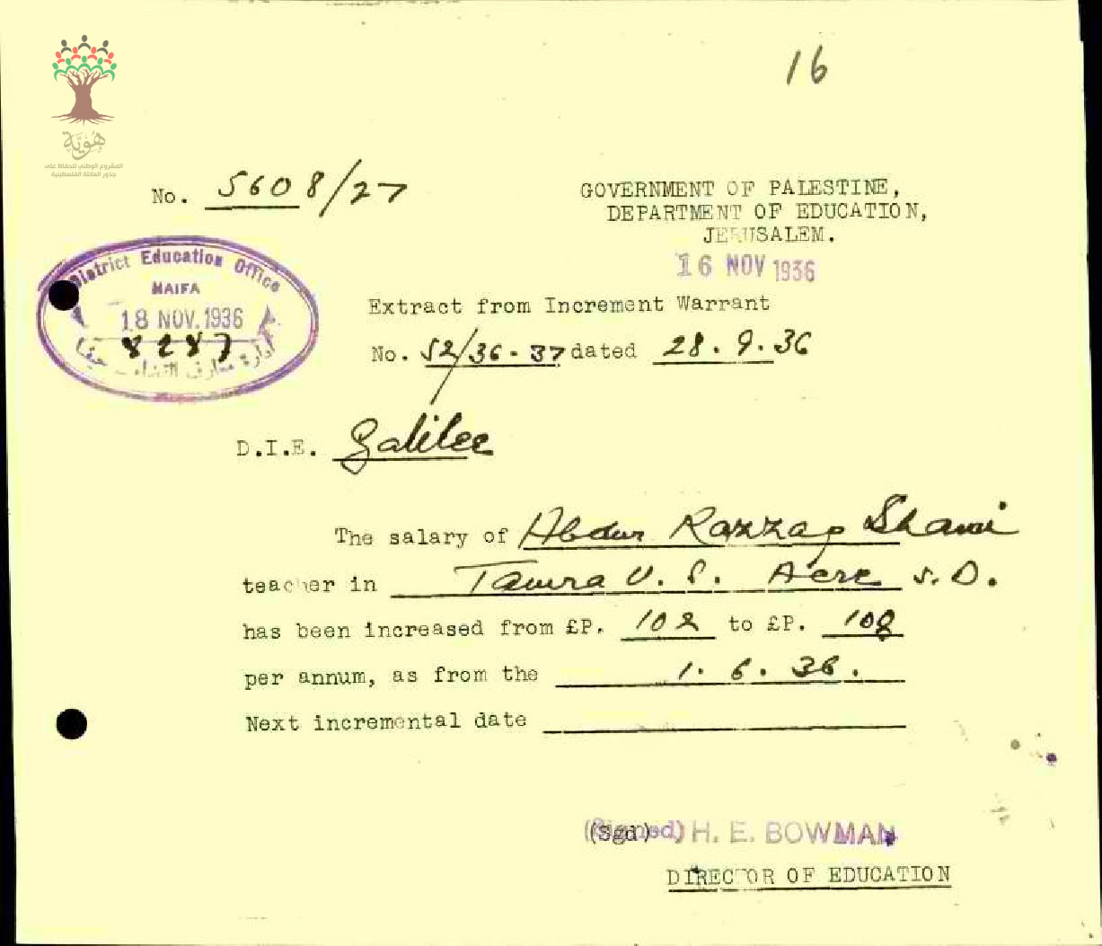 رسالة من مدير المعارف الى مفتش المعارف بخصوص زيادة راتب المعلم عبد الرزاق الشامي
