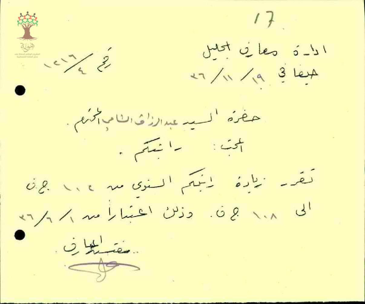 رسالة من مفتش المعارف الى المعلم عبد الرزاق الشامي بخصوص زيادة راتبه