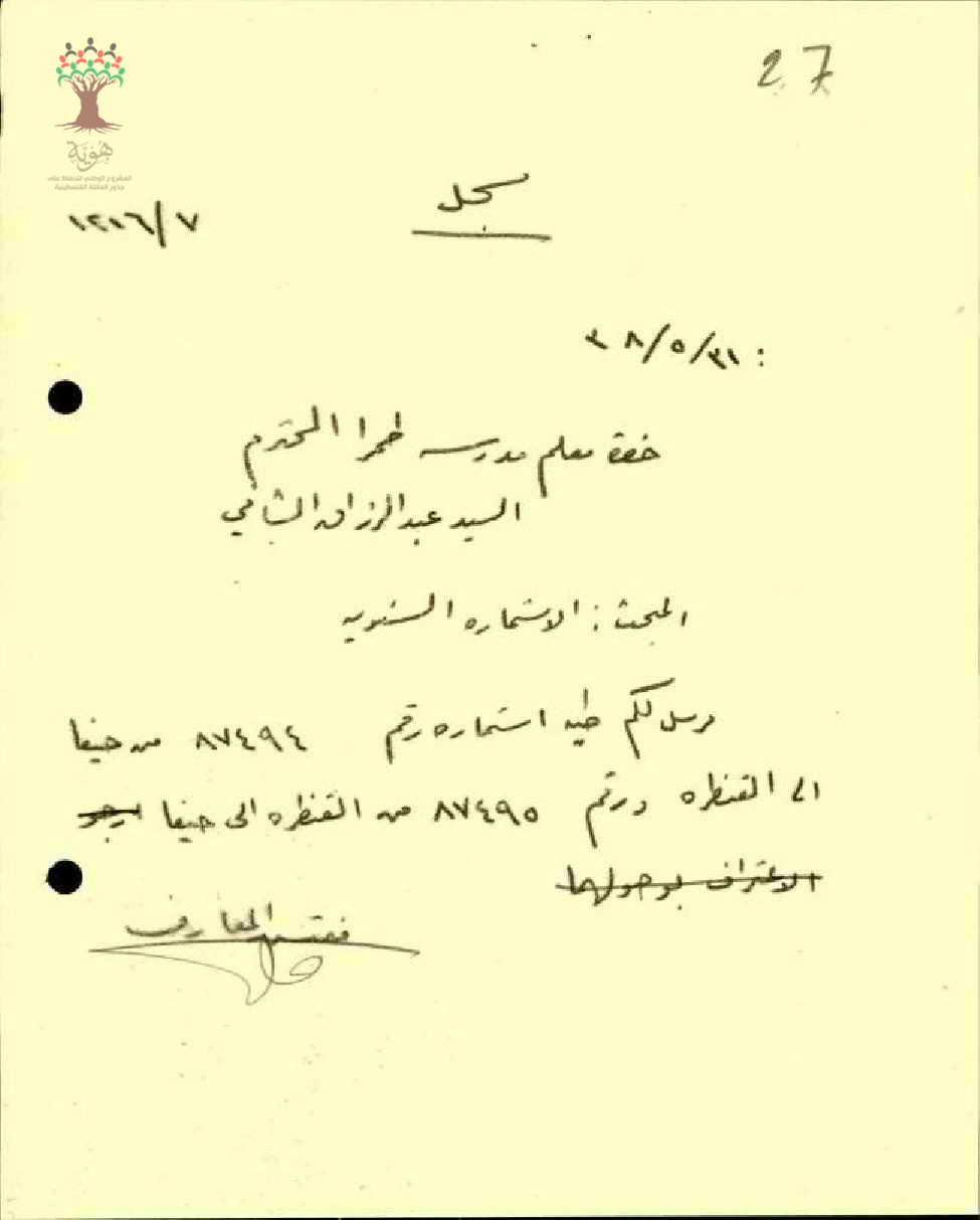 رسالة من مفتش المعارف الى المعلم عبد الرزاق الشامي يعلمه بارسال استمارة السفر