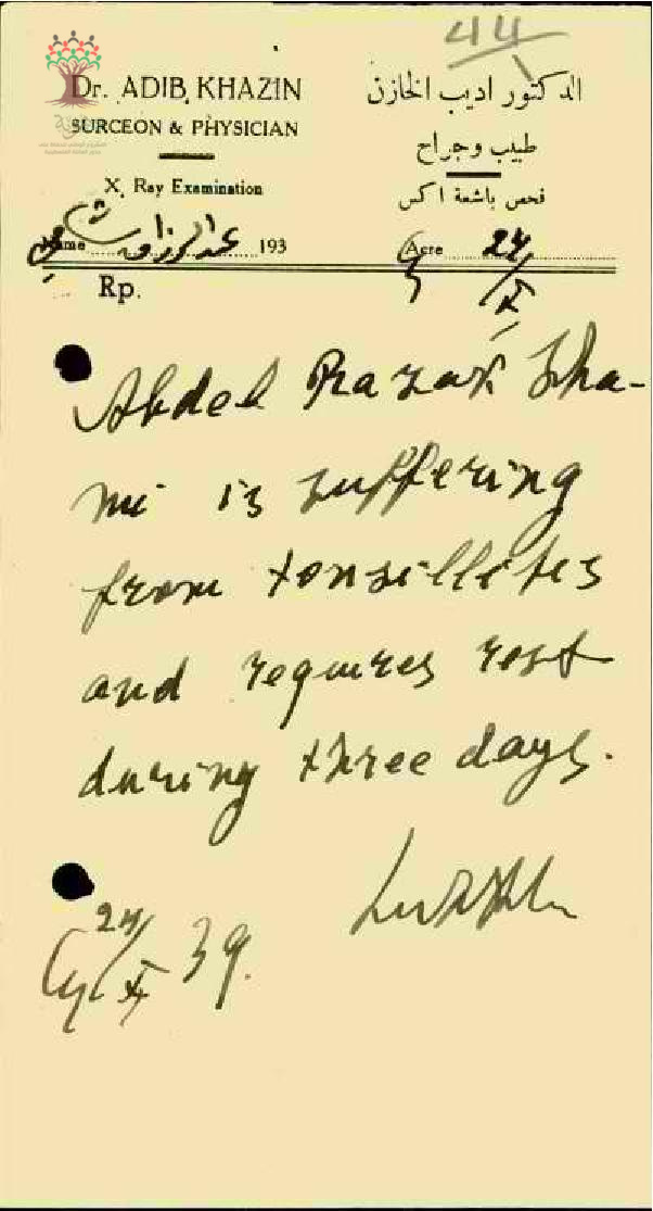 رسالة من المعلم عبد الرزاق الشامي الى مفتش المعارف بخصوص التغيب عن المدرسة مرفقة بالتقارير الطبية
