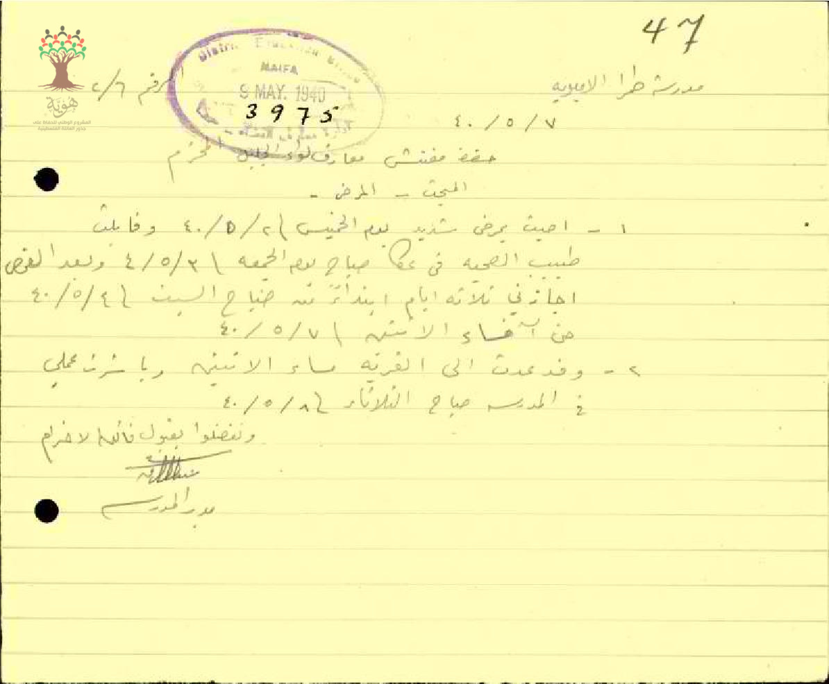 رسالة من المعلم عبد الرزاق الشامي الى مفتش المعارف بخصوص تغيبه وعودته الى العمل