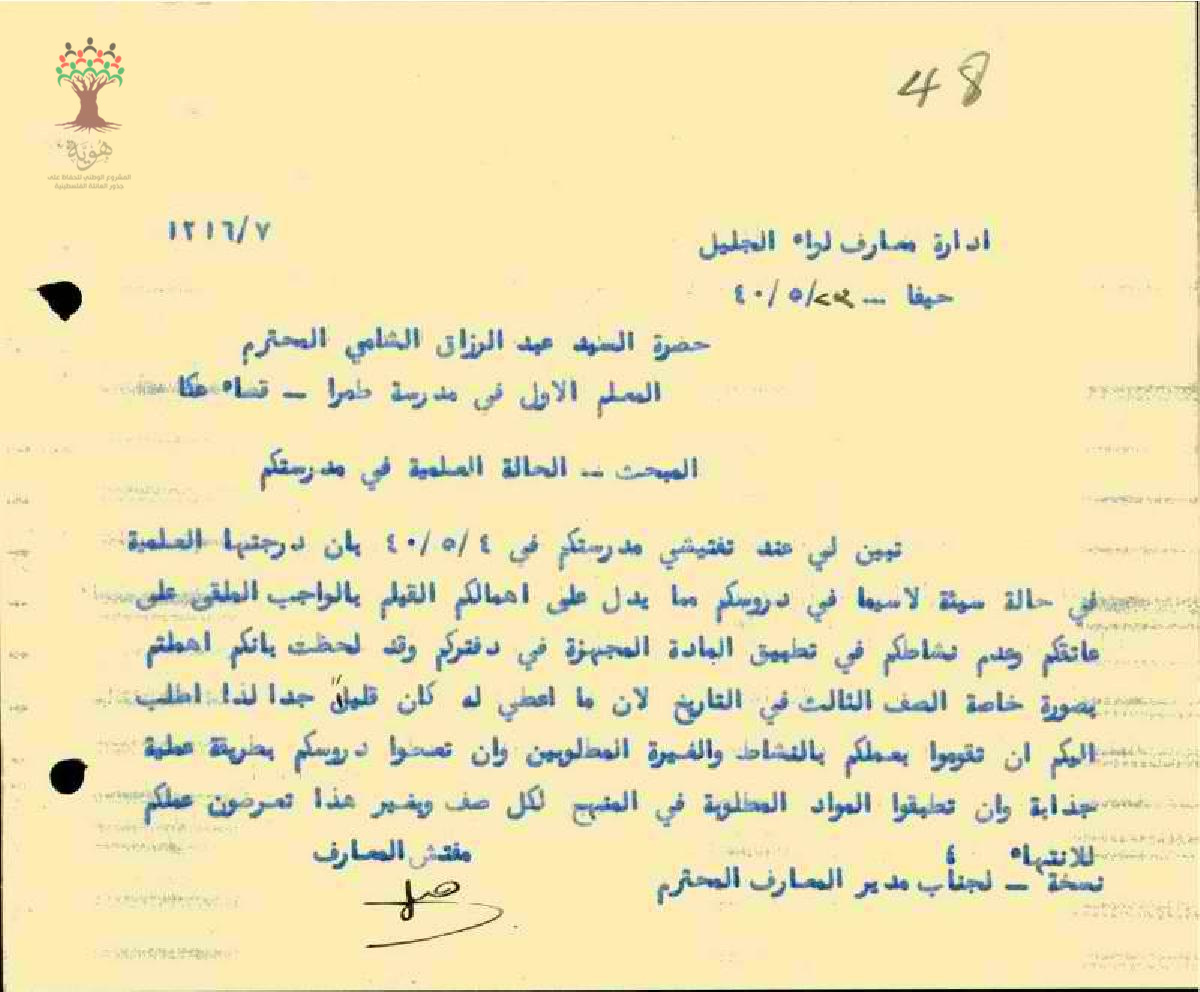 رسالة من مفتش المعارف الى المعلم عبد الرزاق الشامي بخصوص الحالة العلمية في المدرسة