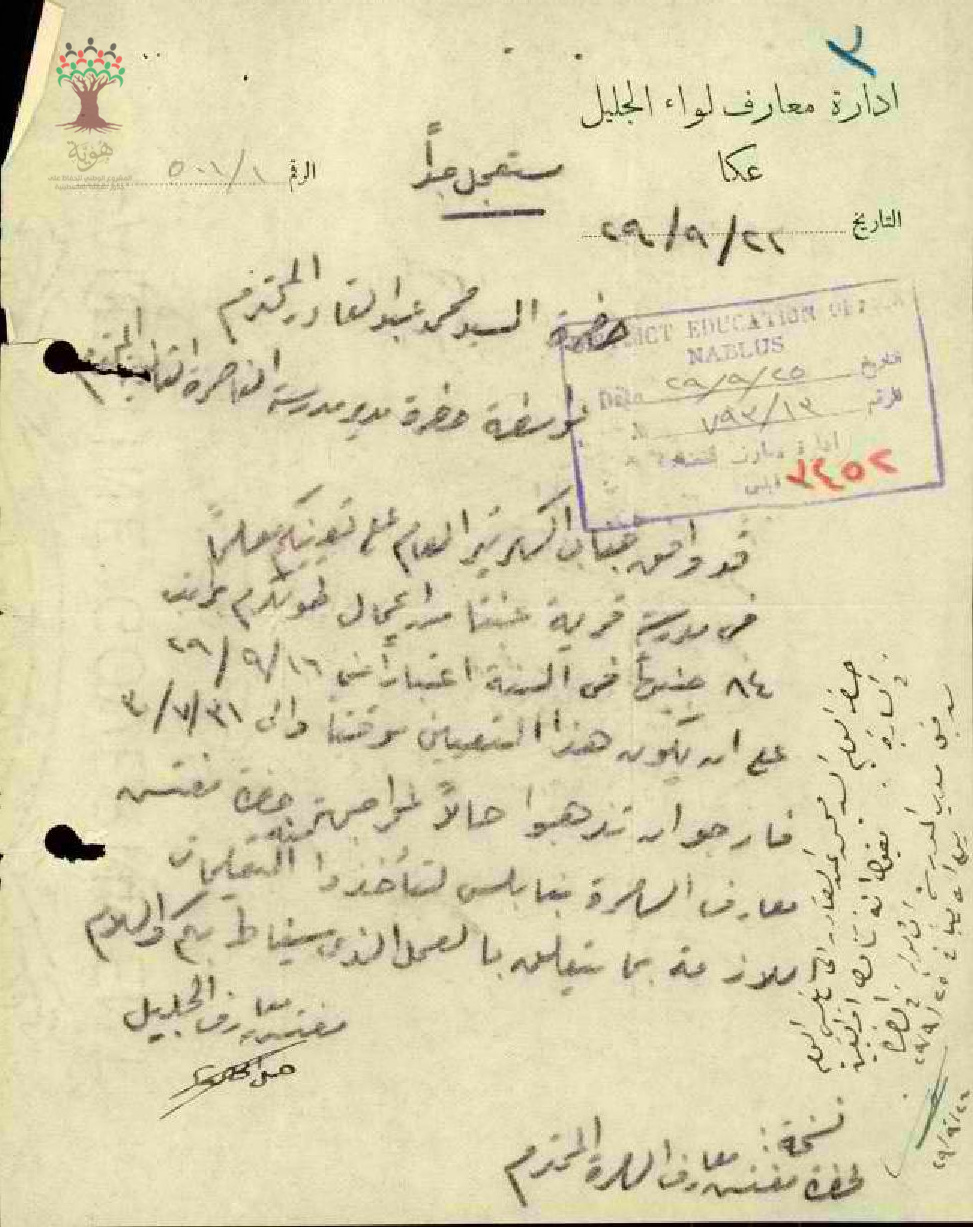 رسالة من مفتش المعارف إلى المعلم محمد عكاشة يخبره بموافقة السكرتير العام على تعيينه معلماً في مدرسة عنبتا