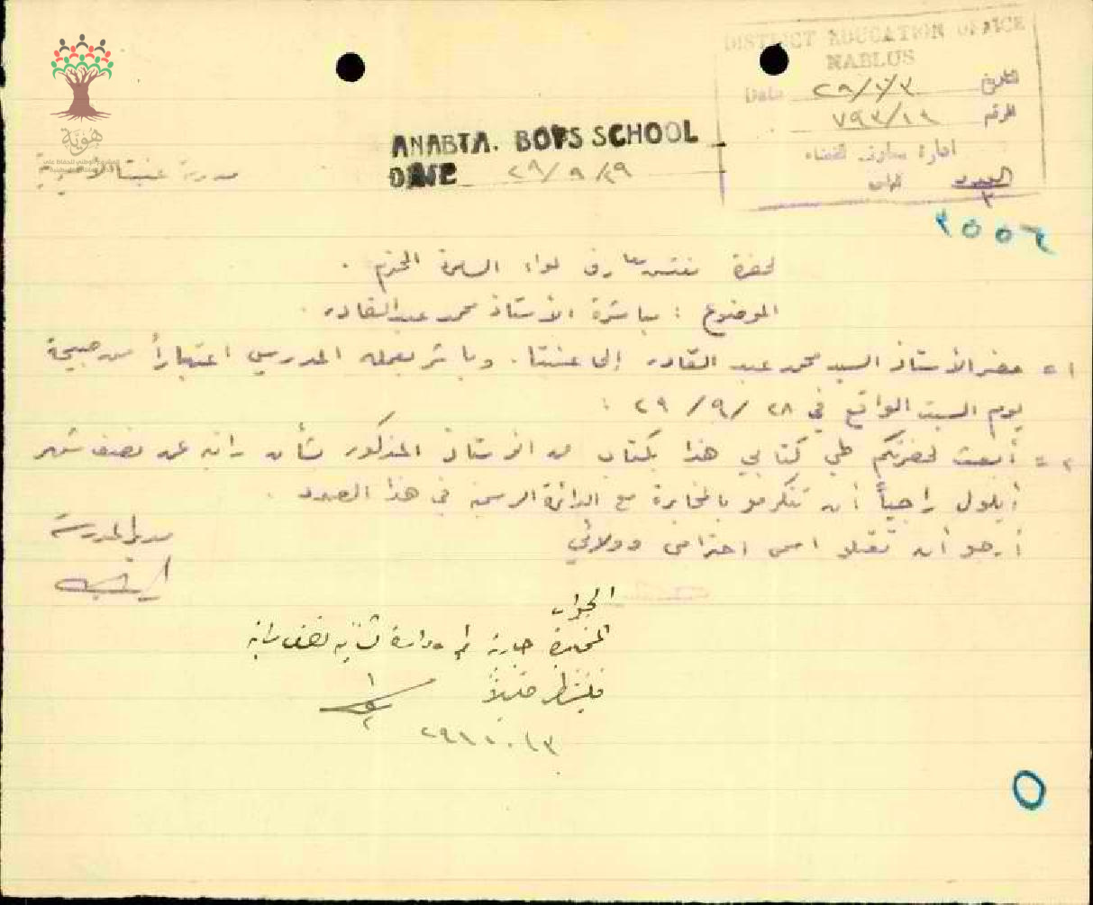 رسالة من مدير مدرسة عنبتا إلى مفتش المعارف يخبره بمباشرة المعلم محمد عكاشة عمله في المدرسة بتاريخ 28/9/1929