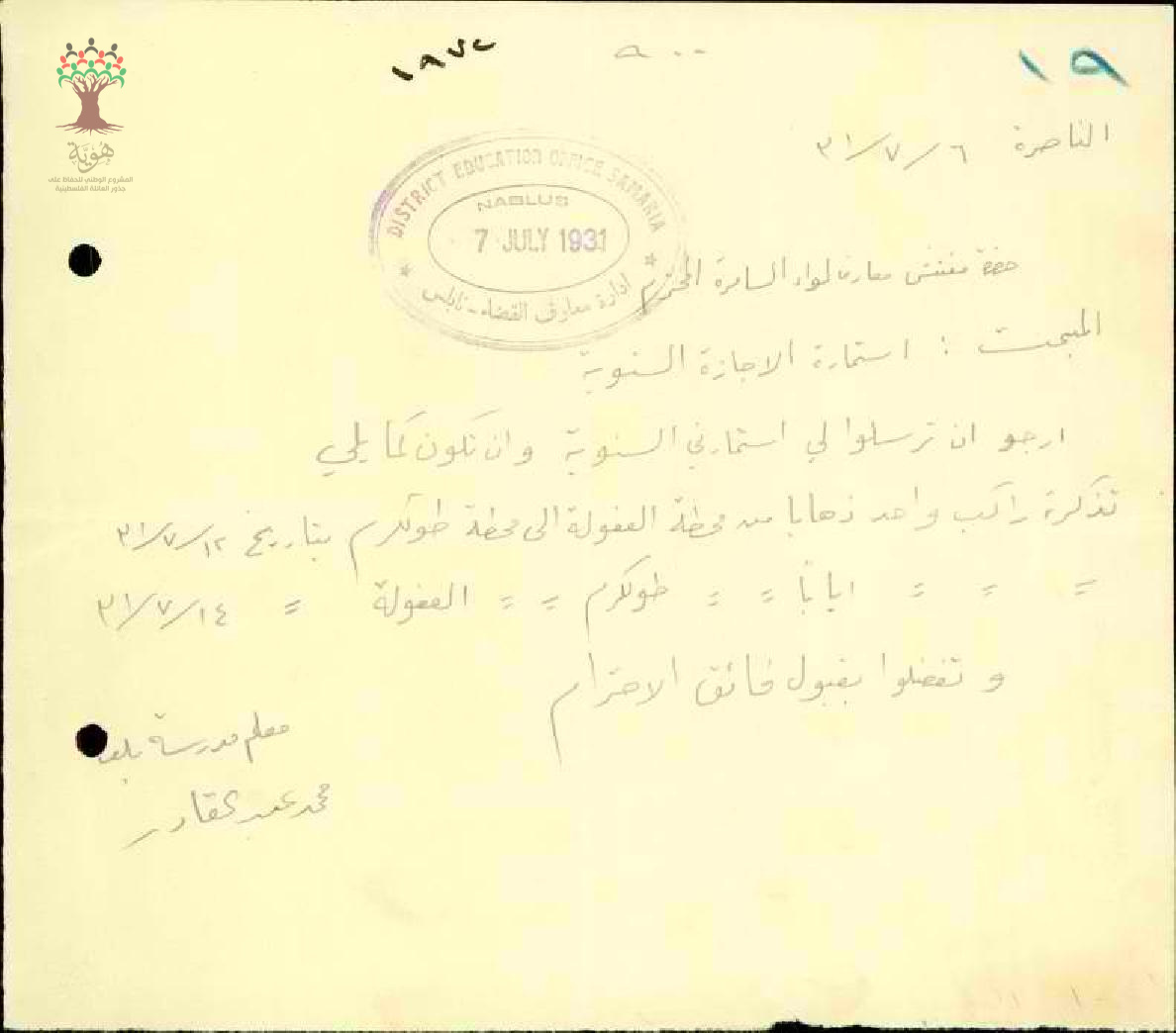 رسالة من المعلم محمد عكاشة إلى مفتش المعارف يطلب الاستمارة السنوية للسفر