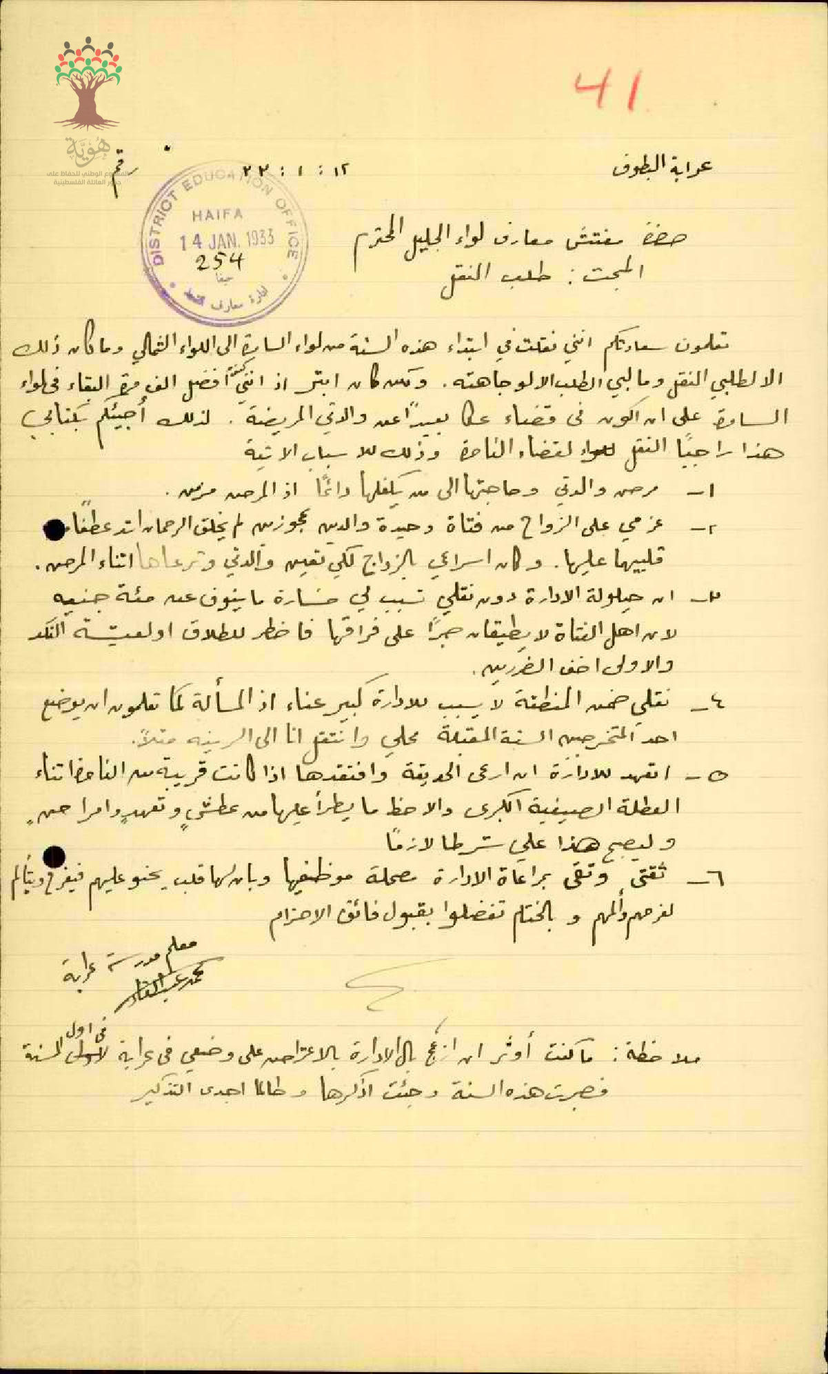 رسالة من المعلم محمد عكاشة إلى مفتش المعارف يطلب فيها نقله من قضاء عكا إلى قضاء الناصرة