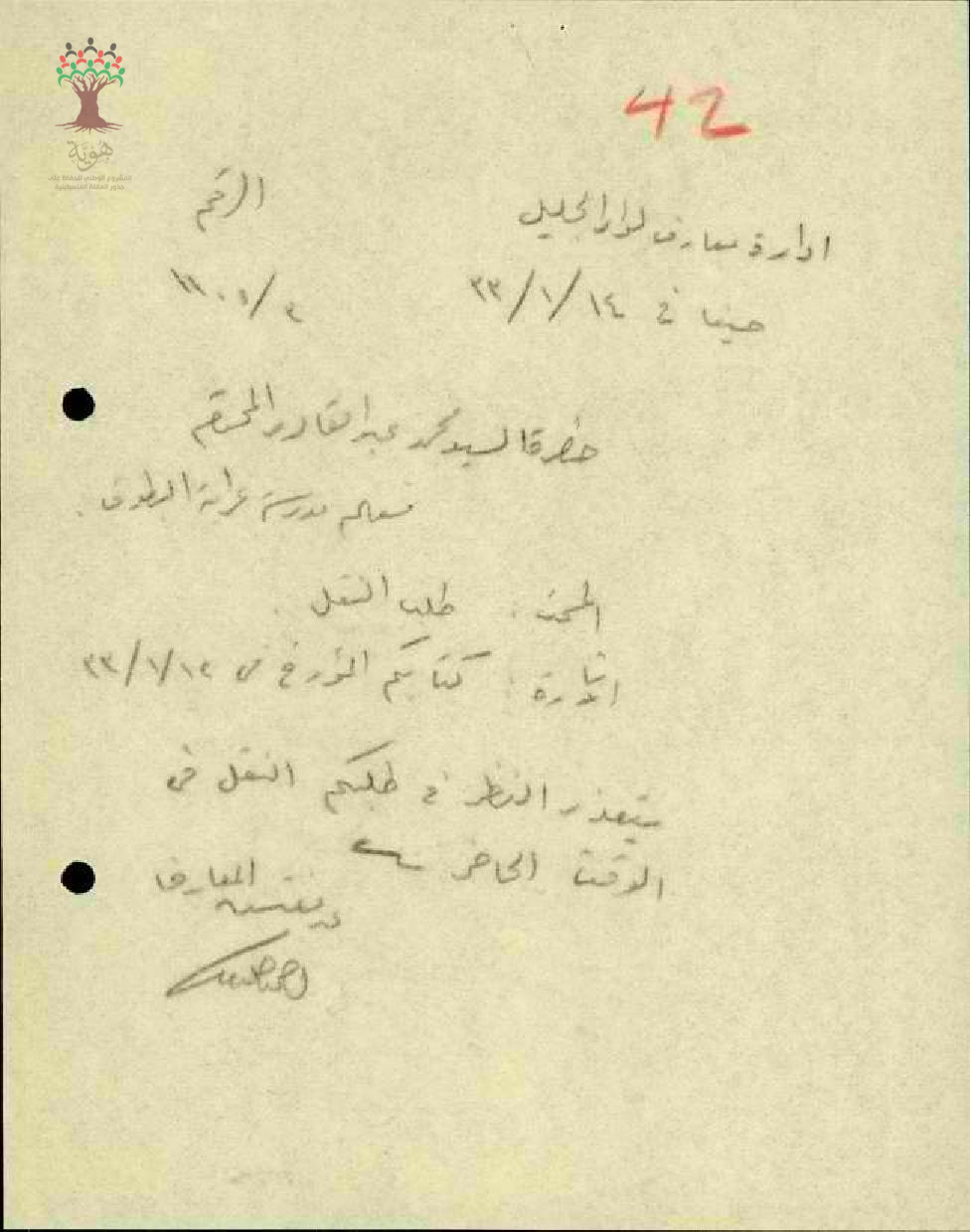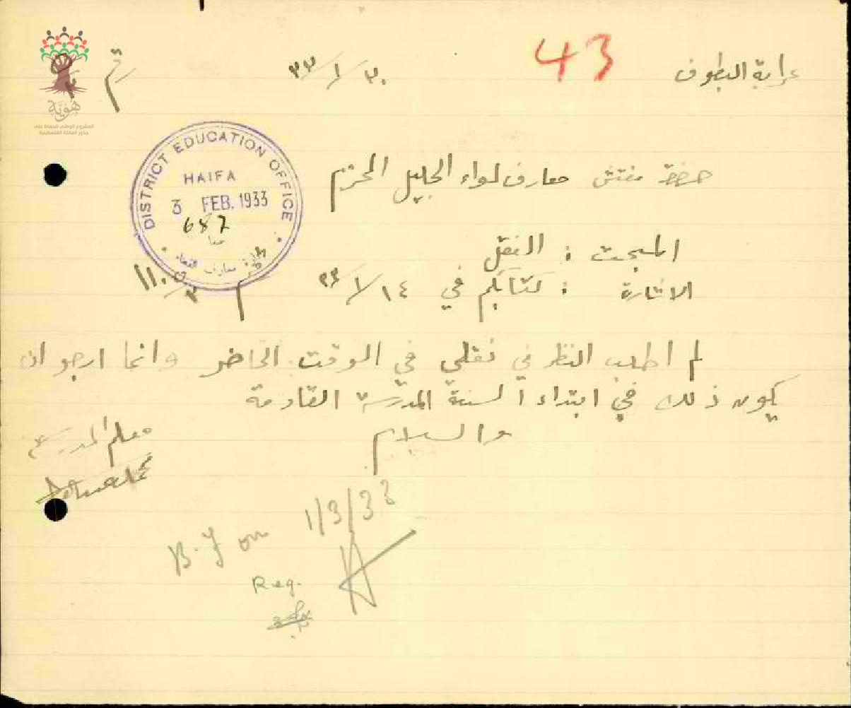 رسالة من مفتش المعارف إلى المعلم محمد عكاشة يخبره بتعذر النظر في طلب النقل