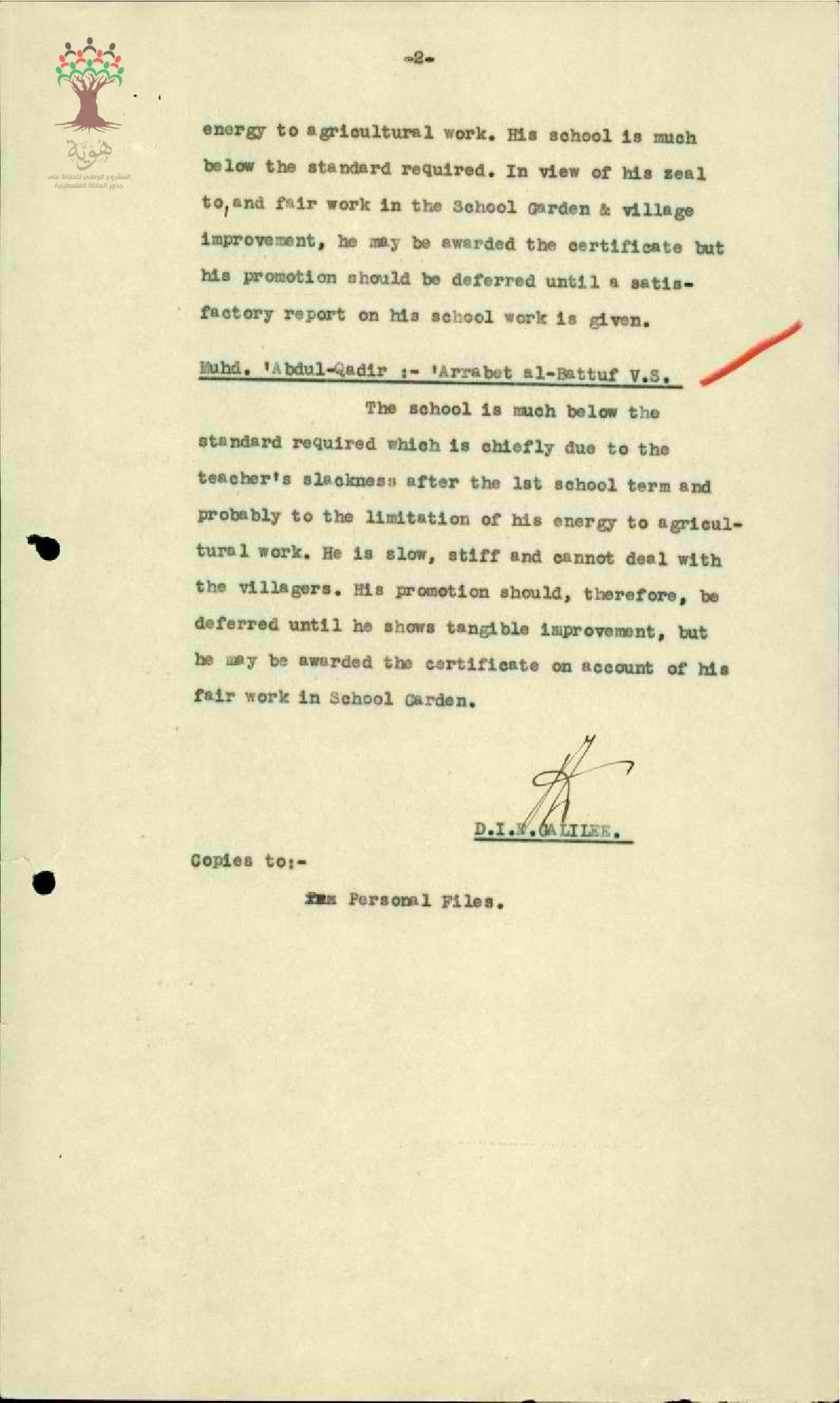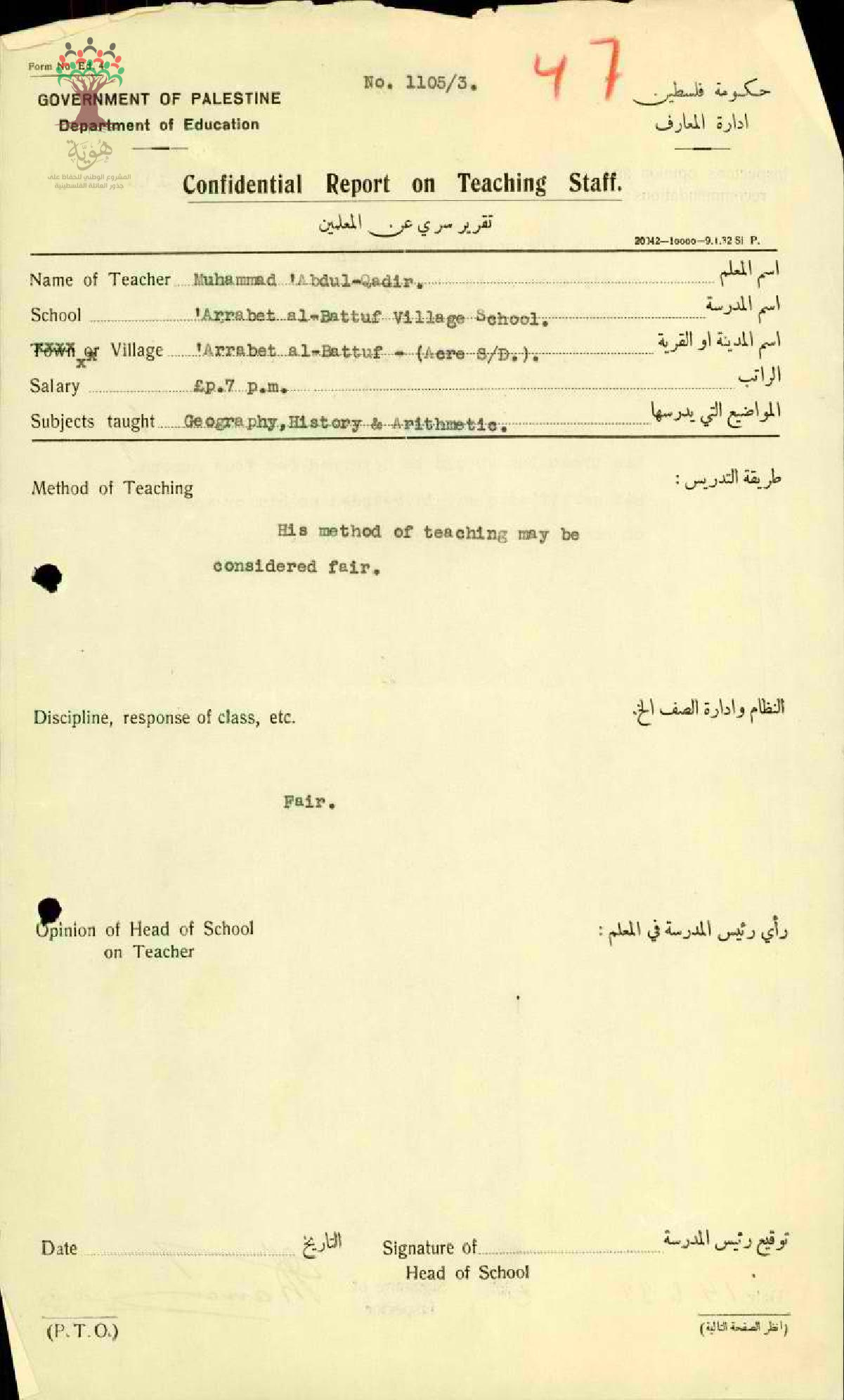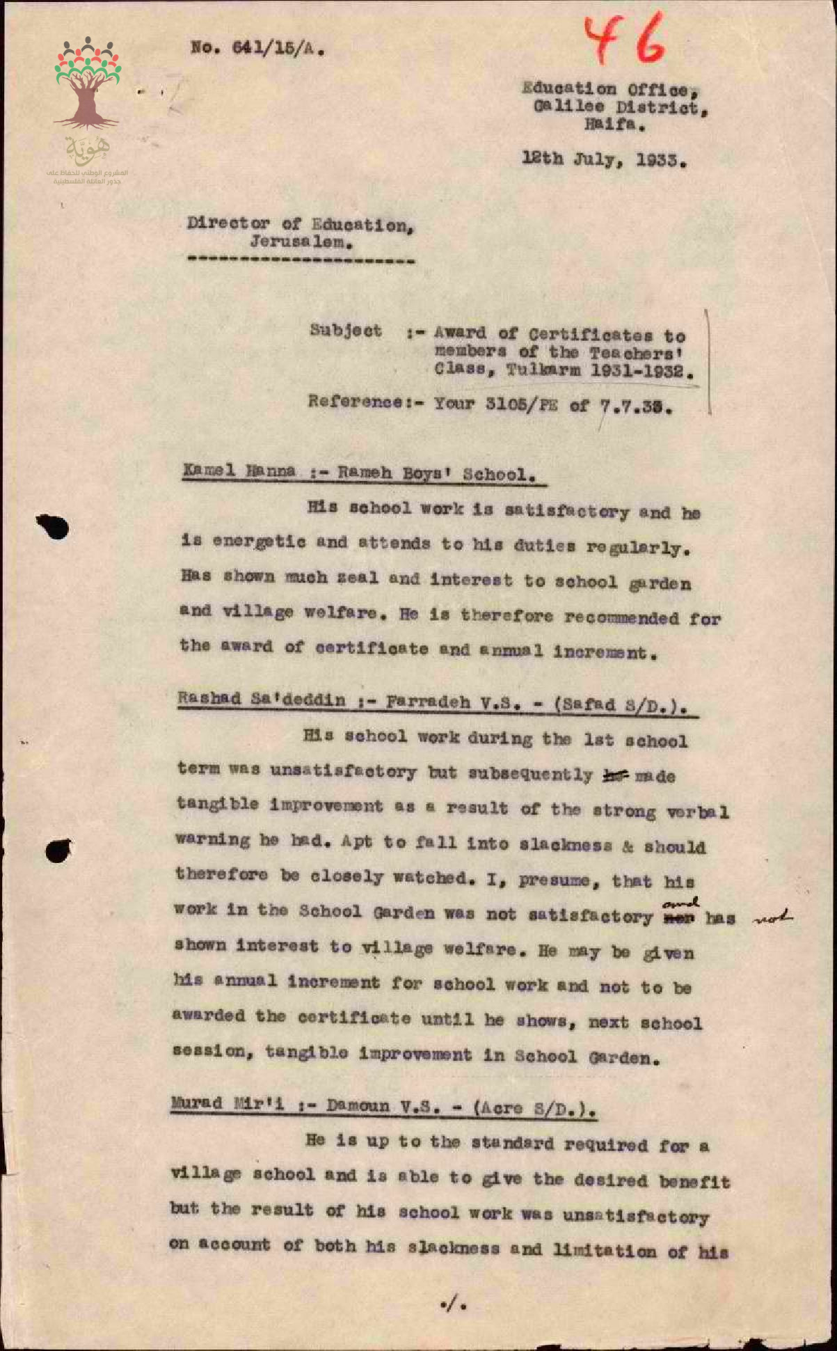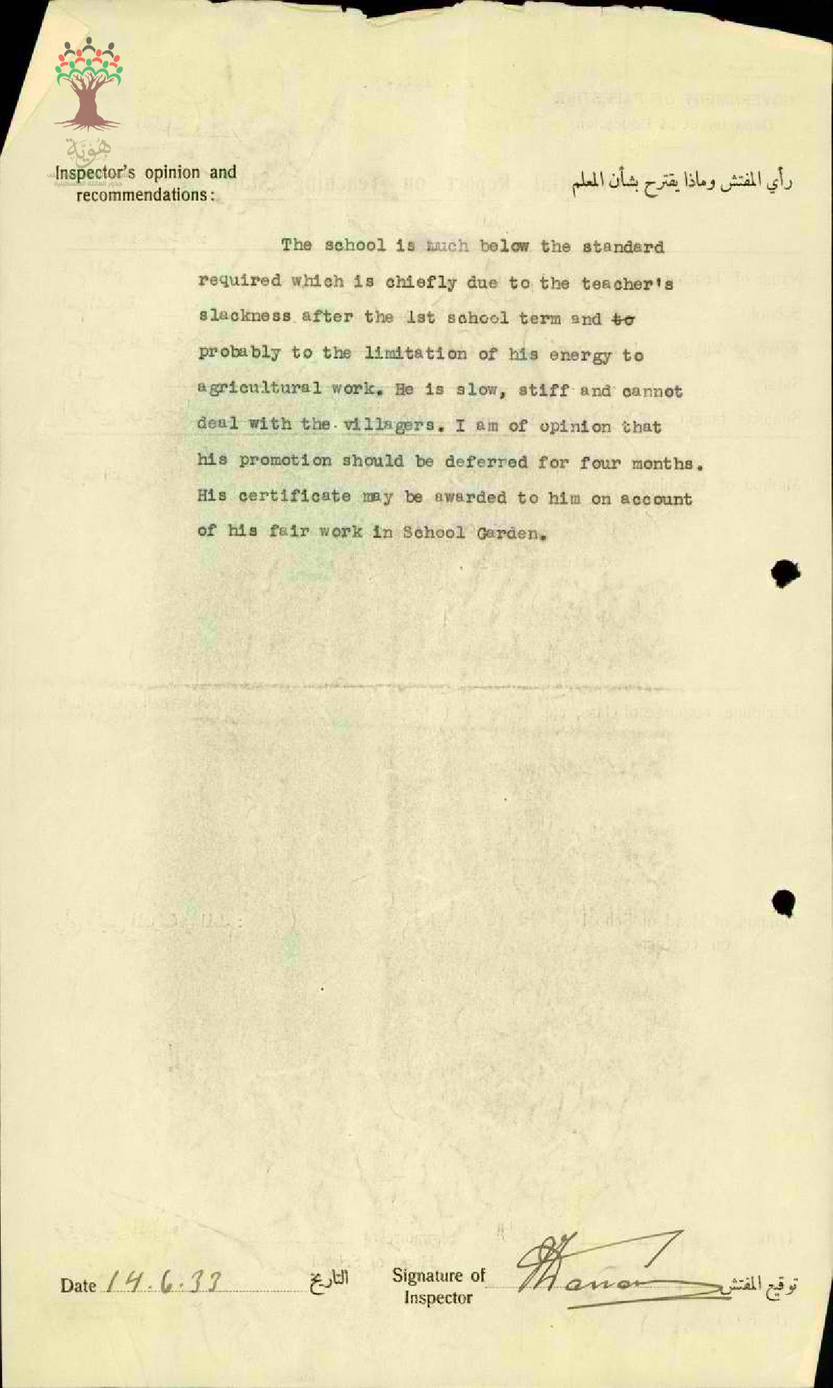 تقارير تفصيلية من مفتش المعارف إلى مدير المعارف عن أداء المعلم محمد عكاشة في مدرسة عرابة البطوف سنة 1933
