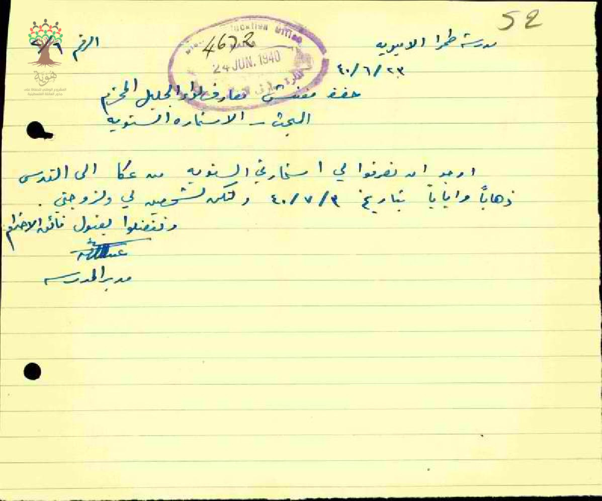رسالة من المعلم عبد الرزاق الشامي الى مفتش المعارف بخصوص استمارة السفر