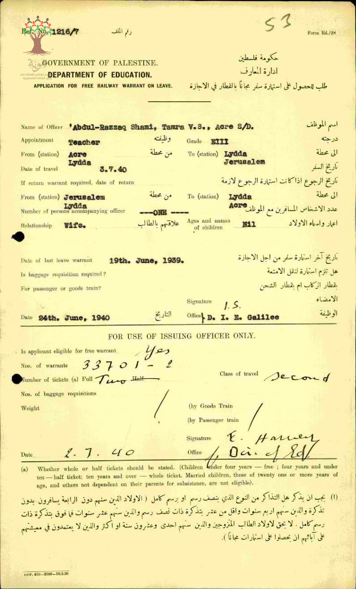 استمارة سفر مقدمة الى المعلم عبد الرزاق الشامي/عكا