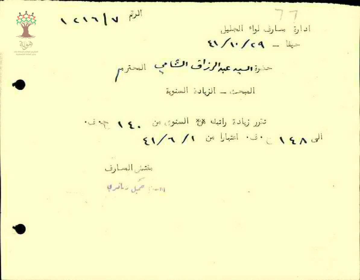 رسالة من مفتش المعارف الى المعلم عبد الرزاق الشامي بخصوص زيادة راتبه