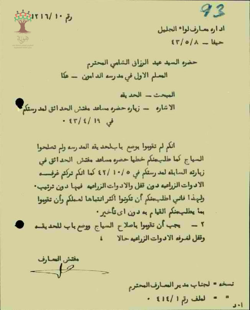 رسالة من مفتش المعارف الى المعلم عبد الرزاق الشامي بخصوص حديقة المدرسة