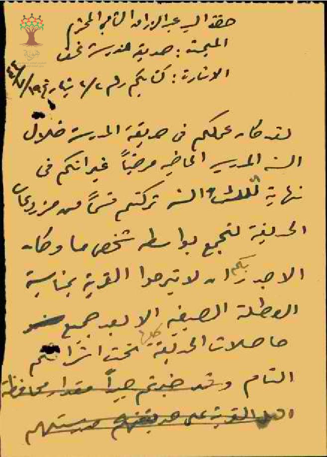 رسالة من مفتش المعارف الى المعلم عبد الرزاق الشامي يبحث كتاب اهمال حديقة المدرسة