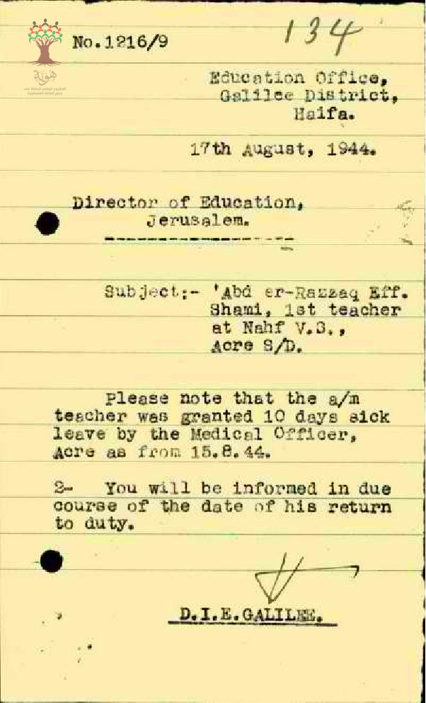 رسالة من مفتش المعارف الى مدير المعارف بخصوص اجازة مرضية للمعلم عبد الرزاق الشامي