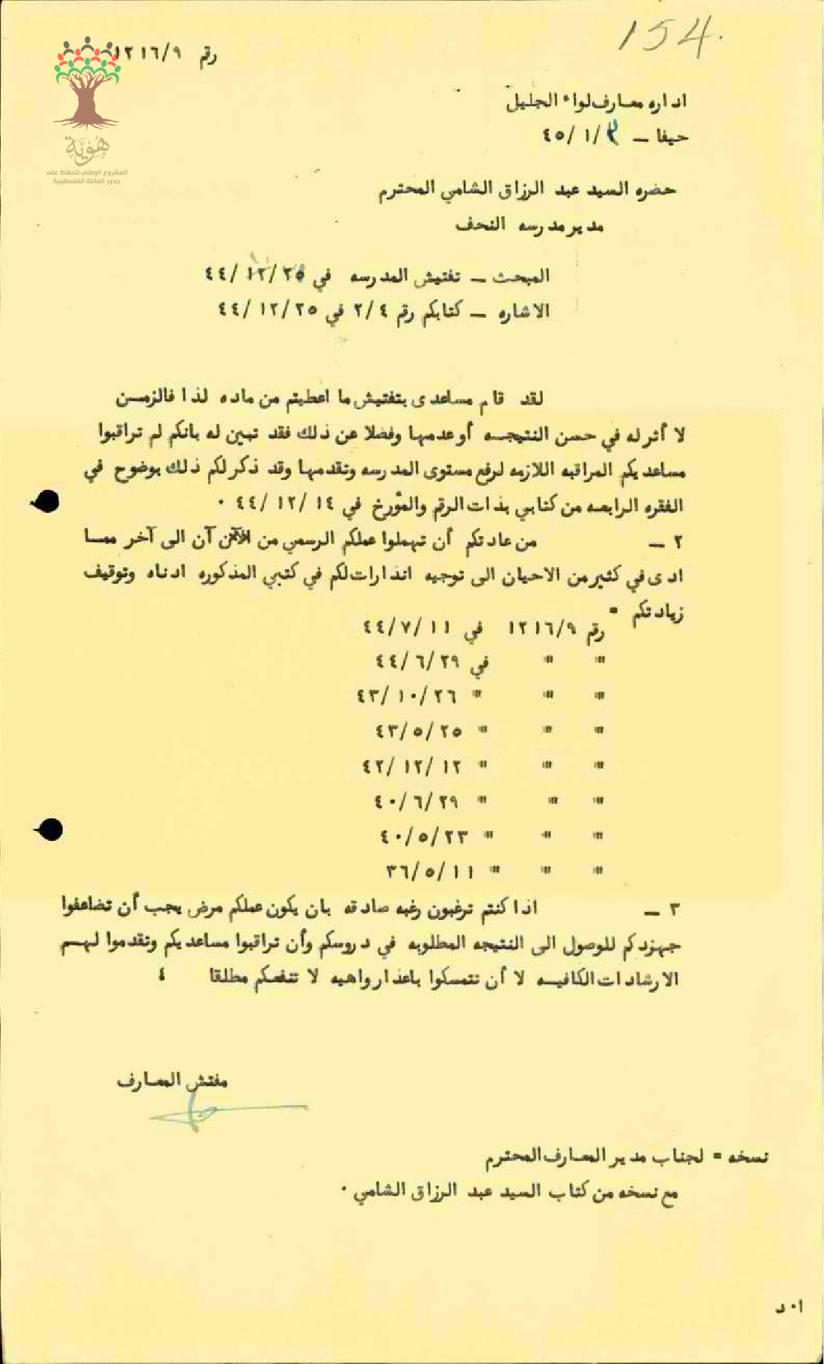 رسالة من مفتش المعارف الى المعلم عبد الرزاق الشامي يبحث موضوع تفتيش المدرسة