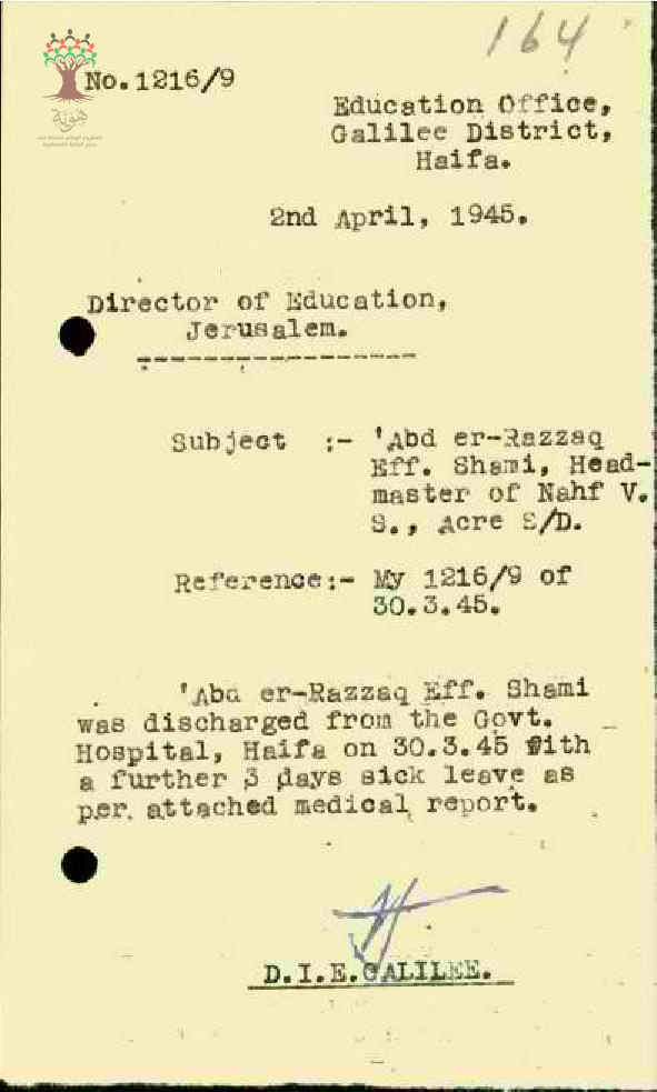 رسالة من مفتش المعارف الى مدير المعارف يعلمه بخروج المعلم عبد الرزاق الشامي من المستشفى