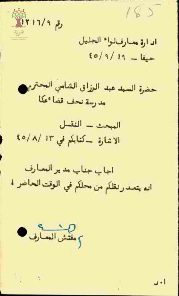 رسالة من مفتش المعارف الى المعلم عبد الرزاق الشامي بخصوص تعذر نقله الى عكا