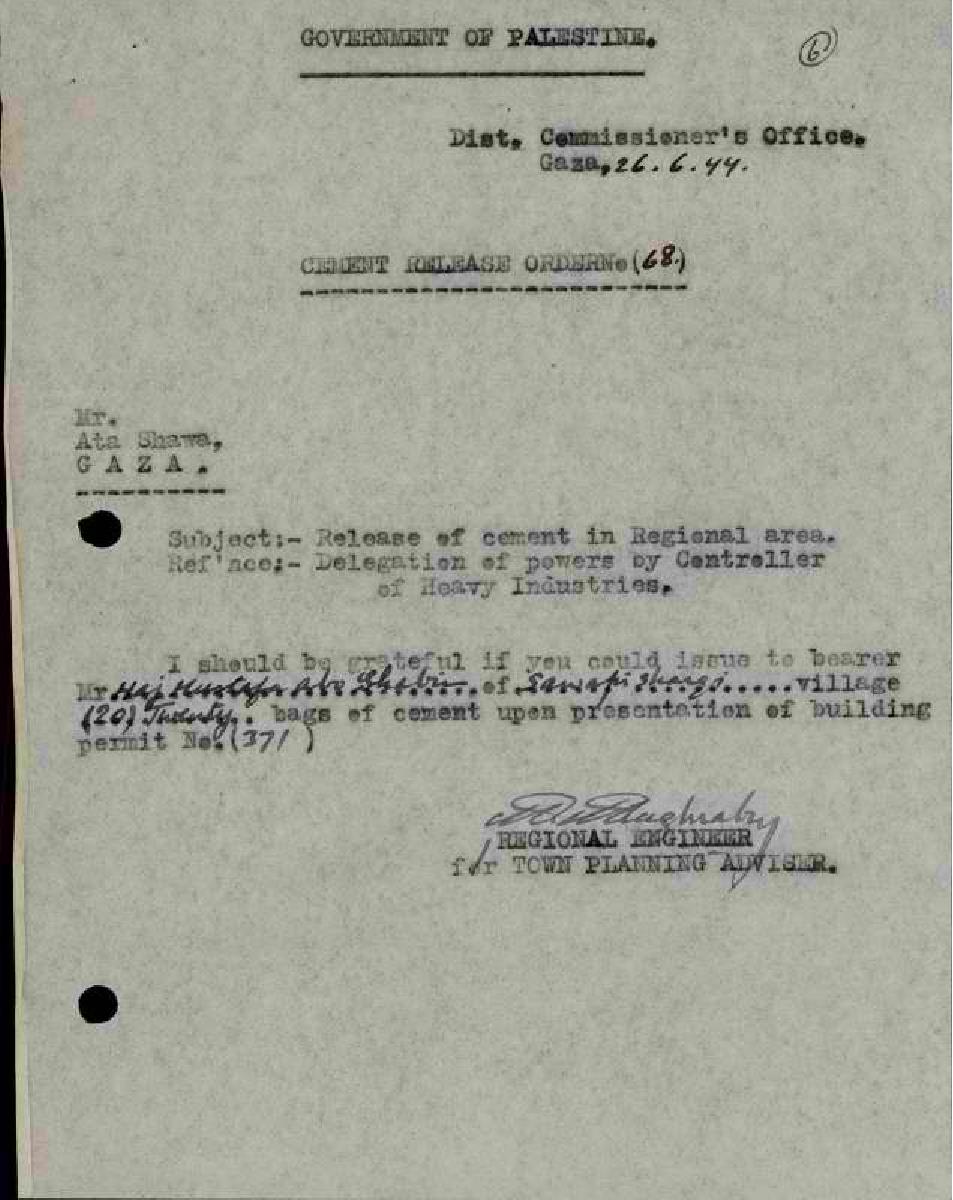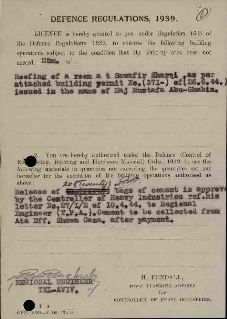 رخصة للحاج مصطفى أبو غبن للحصول على 20 كيس اسمنت للبناء- السوافير الشرقية
