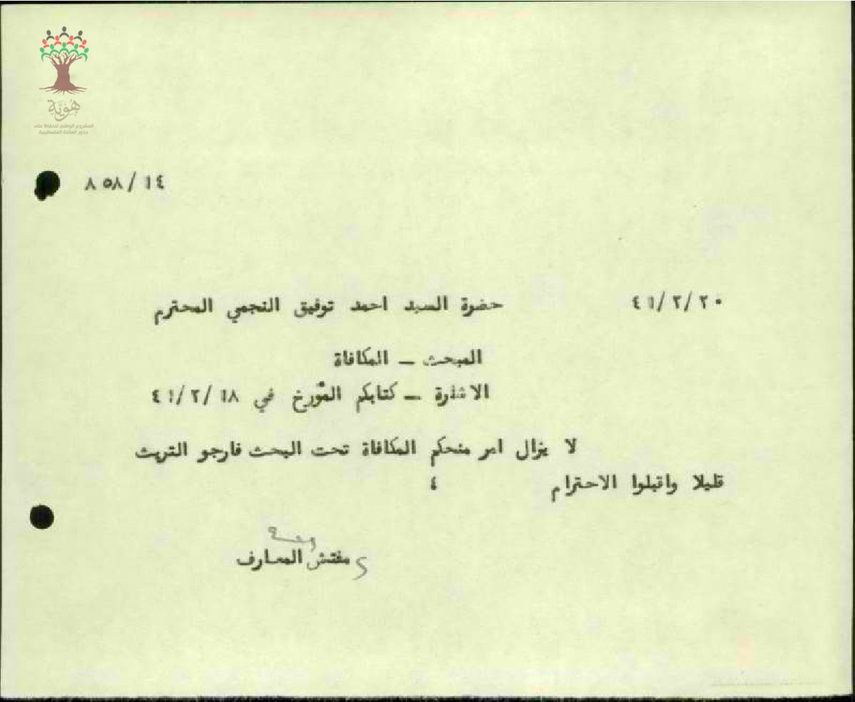 رساله من المعلم احمد توفيق النجمي الى المفتش معارف لواء الجليل بخصوص مكافأة ماليه مازالت قيد البحث